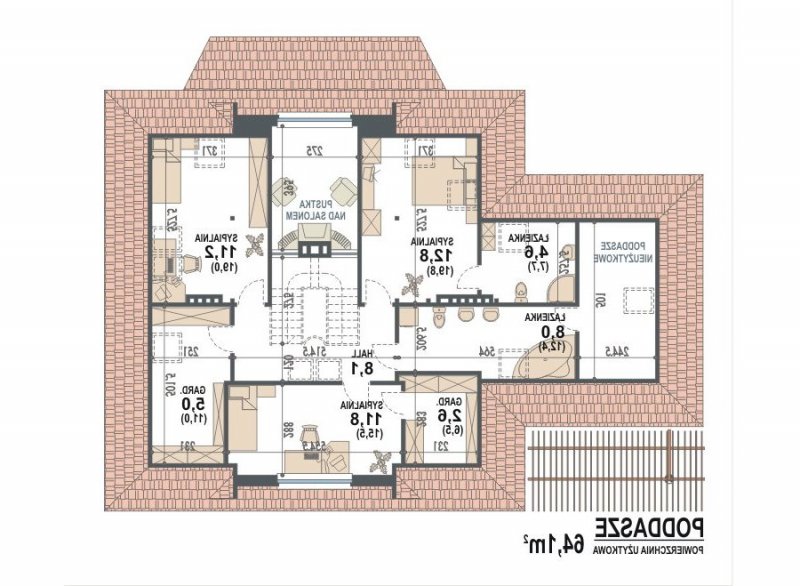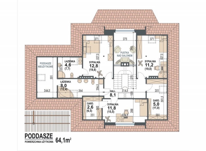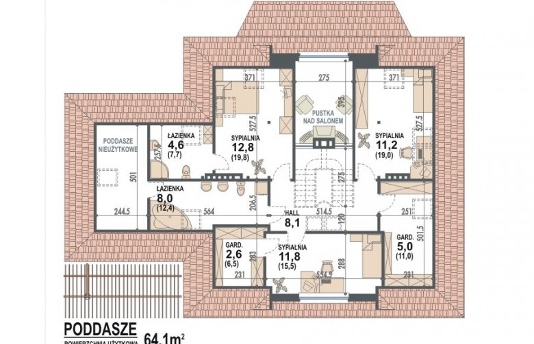 * na piętrze zaprojektowano 3 sypialnie ( sypialnia rodziców z własną łazienką ) oraz ogólnodostępną łazienkę i garderobę