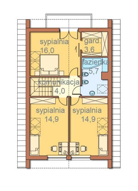 Część nocną na poddaszu tworzą: dwie duże sypialnie dzieci, sypialnia rodziców z garderobą, hall i wygodna łazienka. Wszystkie sypialnie i łazienka będą doświetlone za pomocą okien połaciowych, dodatkowo dwie sypialnie od strony frontowej posiadają okna w ścianie szczytowej, a sypialnia rodziców duże przeszklone drzwi wychodzące na balkon od strony ogrodu.