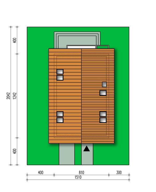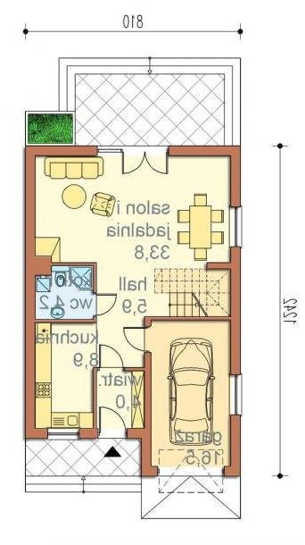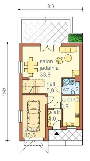 Dom może być wybudowany na wąskiej działce- umożliwia to jego mała szerokość, a ponieważ posiada ścianę boczną bez okien może być zbliżony na 3m od granicy działki lub po niewielkiej zmianie zrealizowany jako bliźniak.