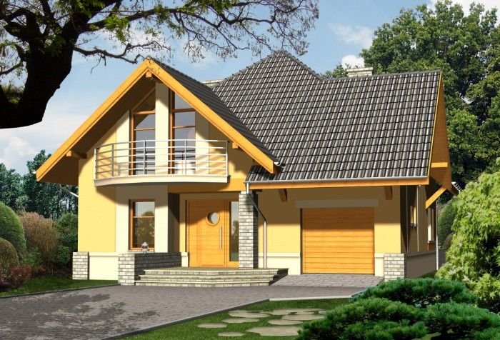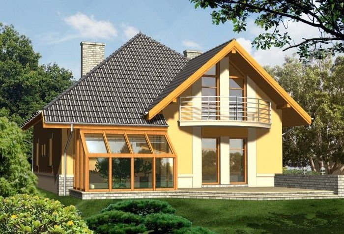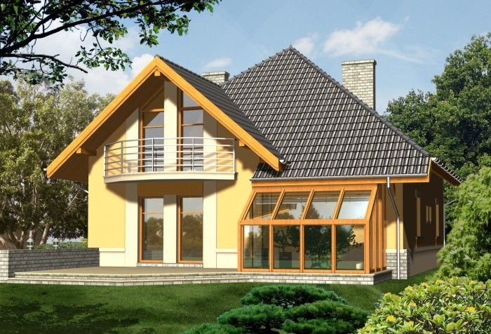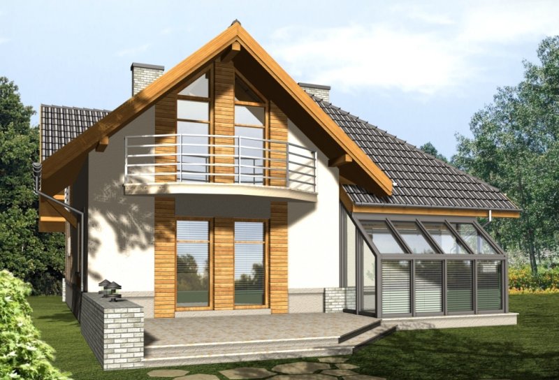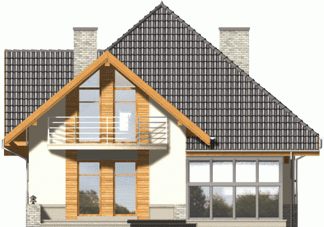 Dom z kopertowym dachem ma nowoczesny charakter dzięki wysokim przeszkleniom poddasza i dużym balkonom. Uwagę przyciąga atrakcyjna przeszklona bryła ogrodu zimowego z tylnej strony budynku.