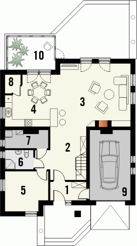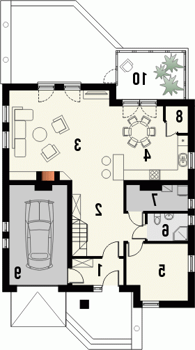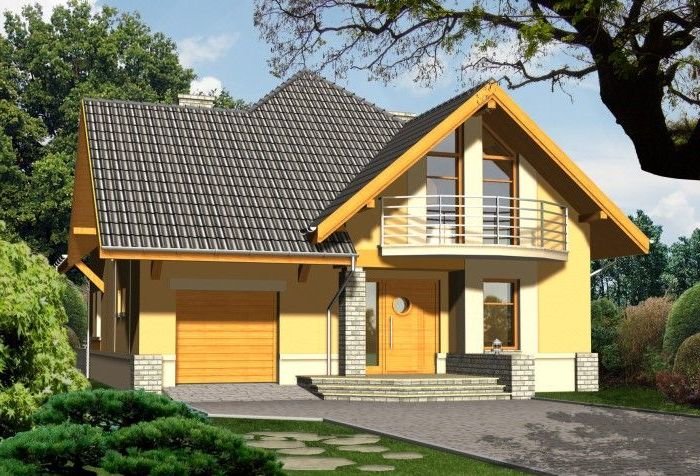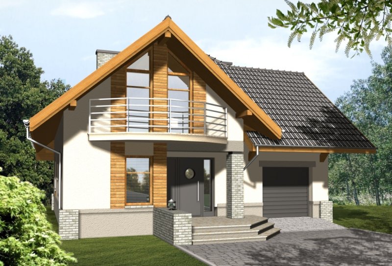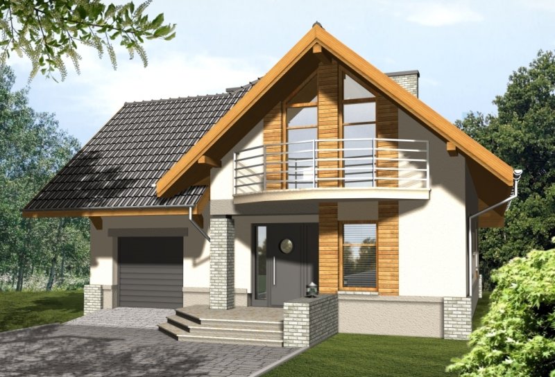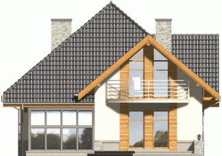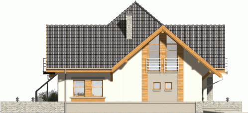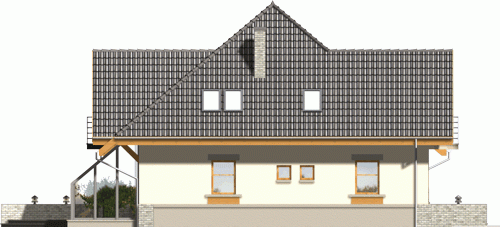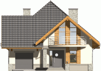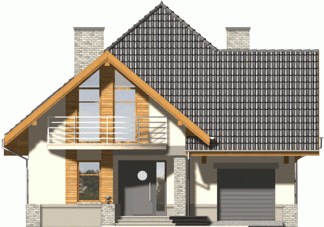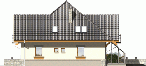 Budynek niepodpiwniczony piętrowy z wbudowanym garażem. Na parterze zaprojektowano salon z kominkiem, kuchnię z jadalnią i spiżarką oraz dodatkowy pokój z łazienką i pomieszczenie gospodarcze. Z jadalni jest wyjście do ogrodu zimowego. Na poddaszu znajdują się cztery pokoje, schowek oraz łazienka. Dokumentacja dostępna również w odbiciu lustrzanym. Dostępna wersja z garażem dwustanowiskowym.