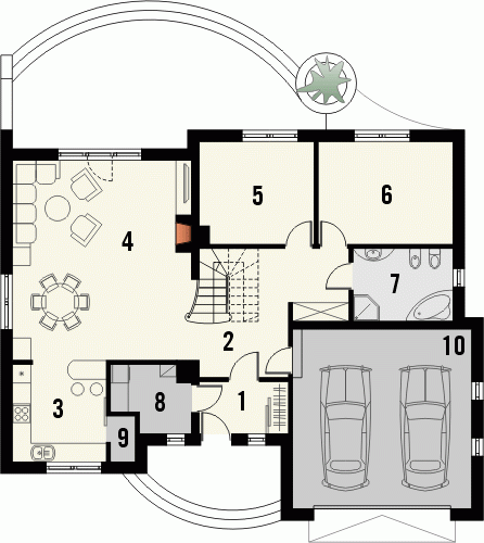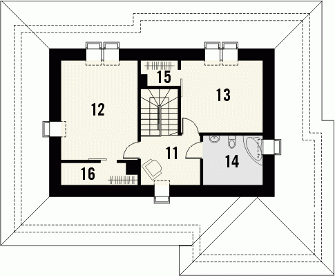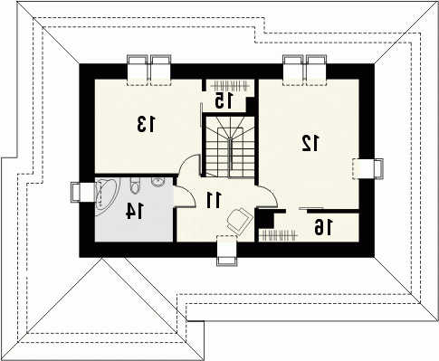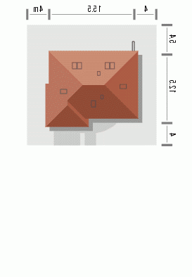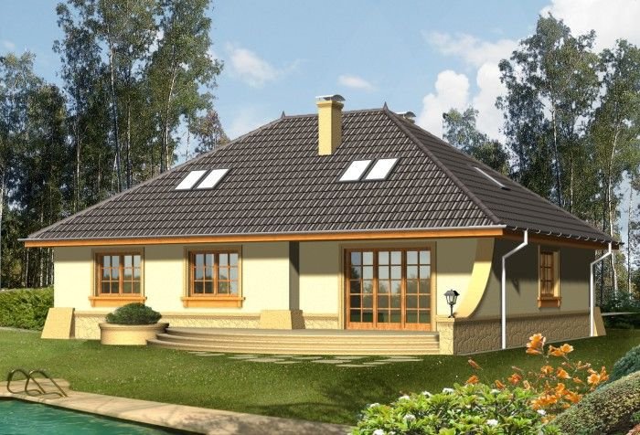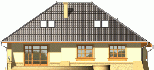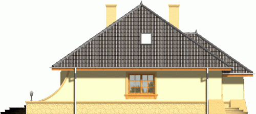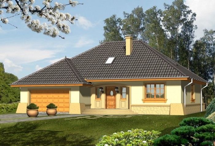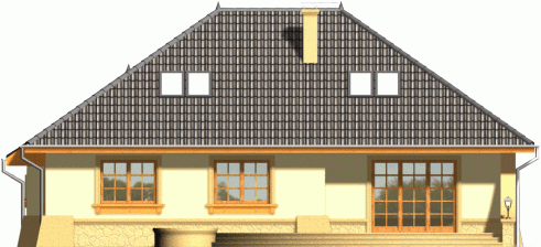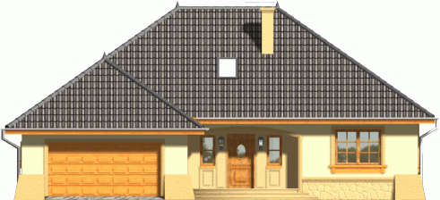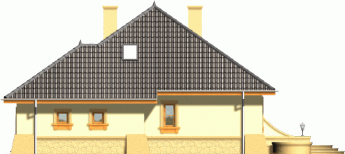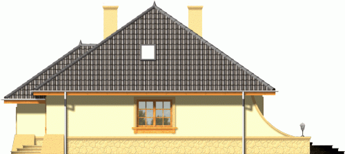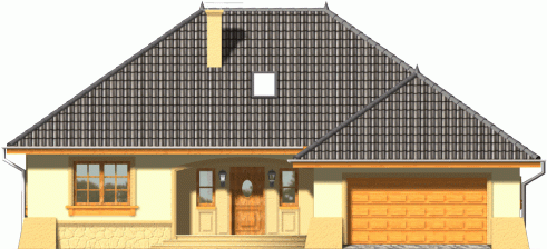 Budynek niepodpiwniczony z piętrem w formie poddasza pod dachem kopertowym. Dom posiada wbudowany garaż dwustanowiskowy. Na parterze obok salonu z kominkiem, jadalni i kuchni ze spiżarnią zaprojektowano także dwa pokoje z łazienką, pomieszczenie gospodarcze i garaż. Na piętrze (poddasze możliwe też ewentualnie do późniejszego wykończenia) zaprojektowano 2 sypialnie z garderobami i łazienkę. Dokumentacja dostępna również w odbiciu lustrzanym.