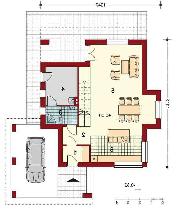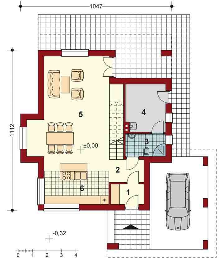Fundamenty wylewane. Ściany fundamentowe wykonane z bloczków betonowych. Ściany dwuwarstwowe o podwyższonych parametrach enegrooszczędności, wykonane z bloczku gazobetonowego z ociepleniem wełną mineralną. Strop gęstożebrowy lub monoloityczny. Pokrycie dachu stropodach.