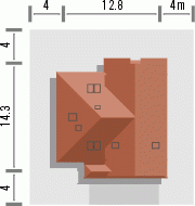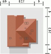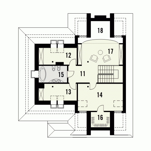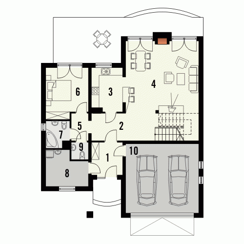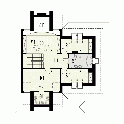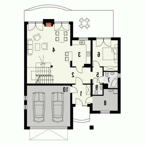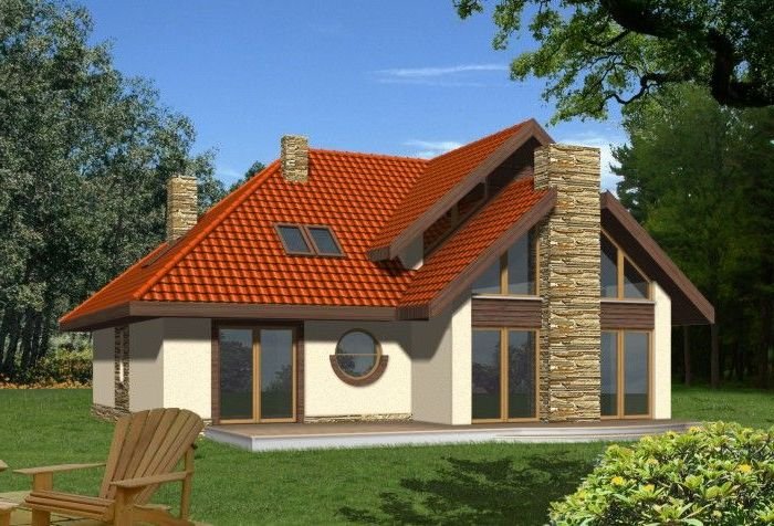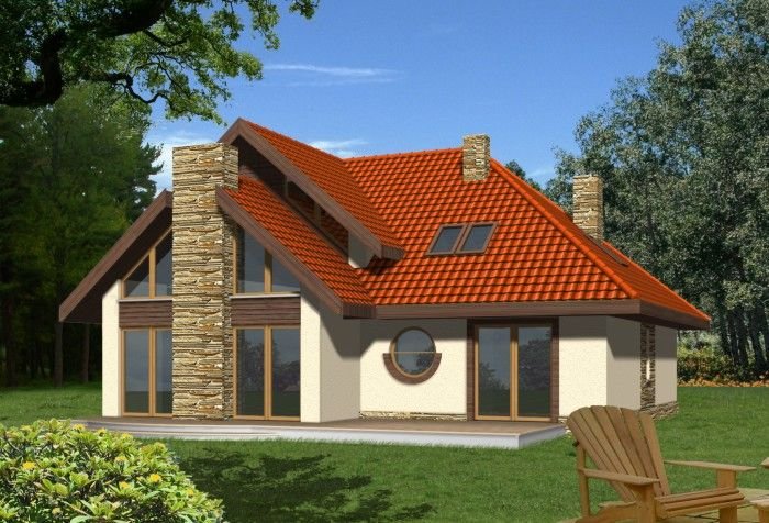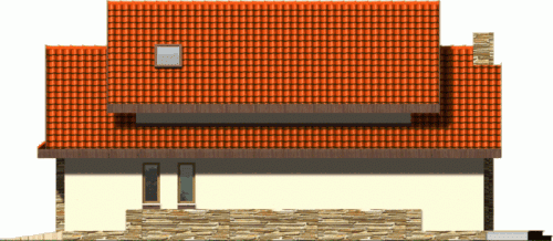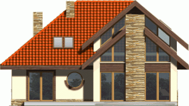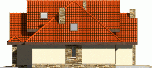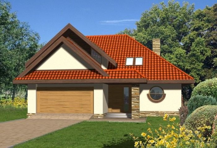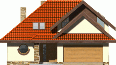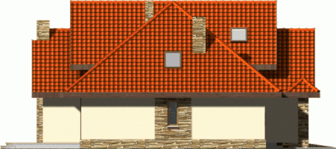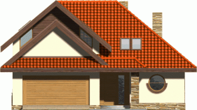 Budynek niepodpiwniczony piętrowy z wbudowanym garażem dwustanowiskowym. Na parterze znajduje się salon z kominkiem, którego widoczny w elewacji komin jest elementem rozpoznawczym tego efektownego domu. Funkcję dzienną uzupełnia kuchnia połączona barem z pokojem dziennym, oraz dodatkowy pokój z łazienką dostępną z korytarza. Na piętrze znajdują się 3 sypialnie, w tym jedna doświetlona od góry z garderobą i przestronna łazienka. Piętro jest otwarte na parter dzięki antresoli, na której można zaaranżować biblioteczkę. Dokumentacja dostępna również w odbiciu lustrzanym.