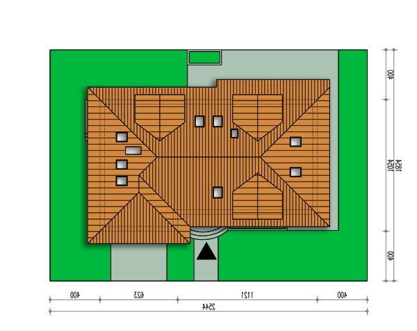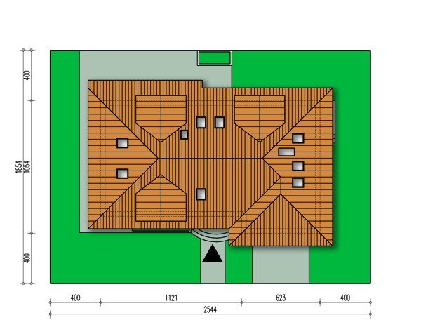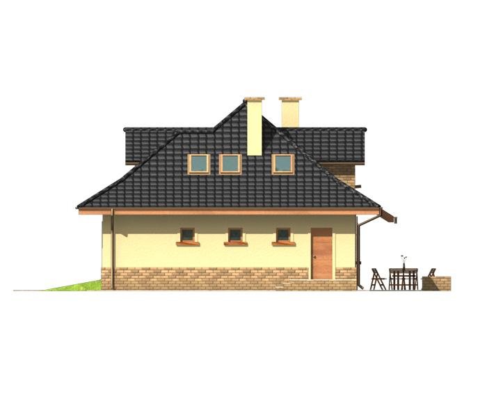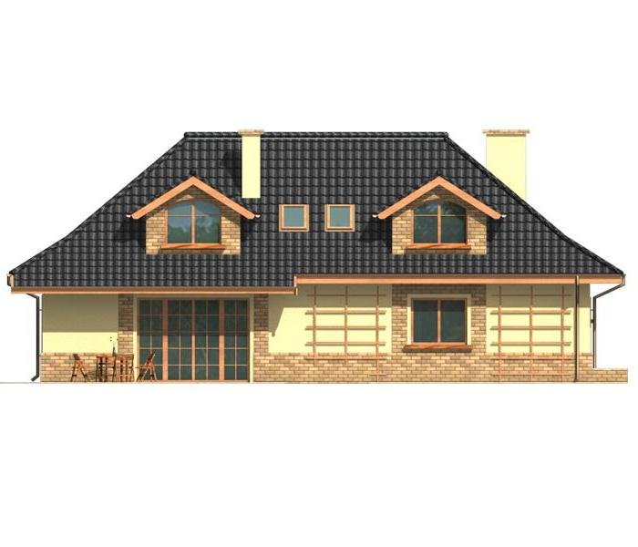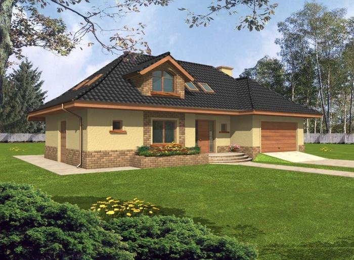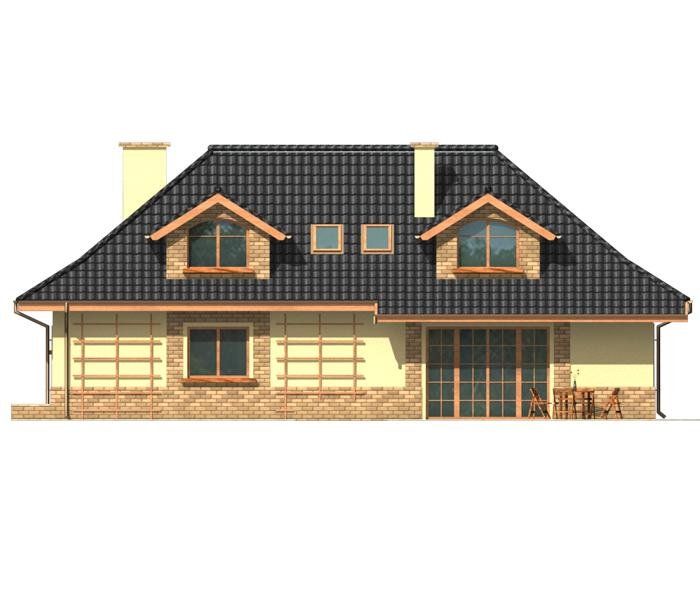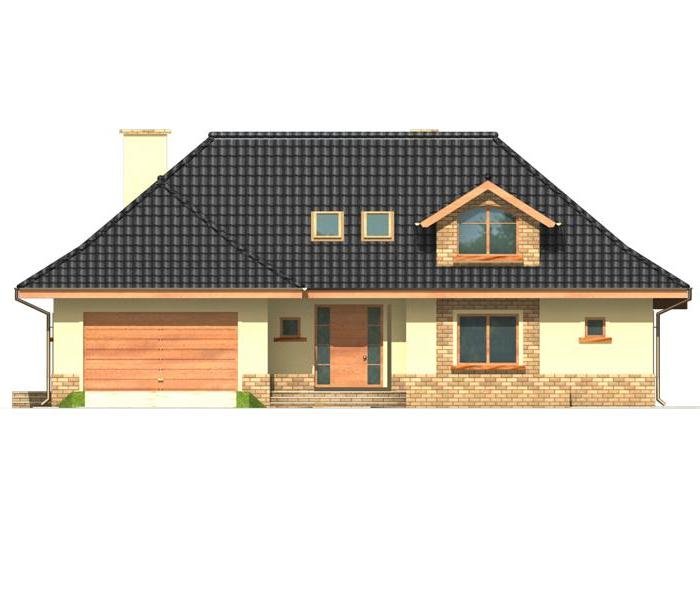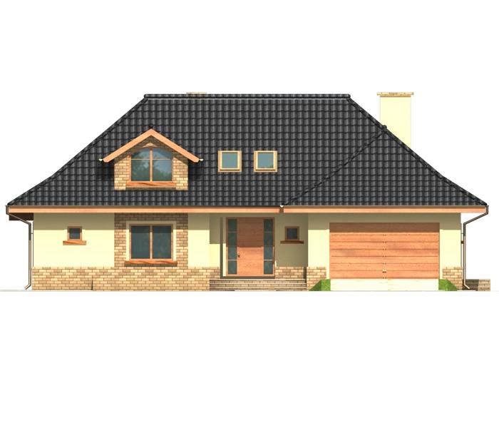Dom posiada prosty układ - główna część domu na planie prostokąta z wysunietym garażem dwustanowiskowym. Bryła domu jest zwarta i mało skomplikowana, przekryta czterospadowym dachem z wysunietą częścią nad garażem. Konstrukcja dachu nie jest skomplikowana, a lukarny z dużymi oknami dodają domowi uroku.