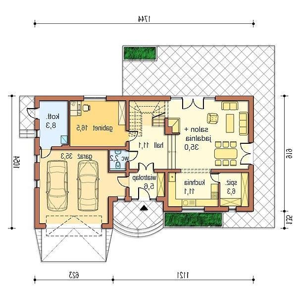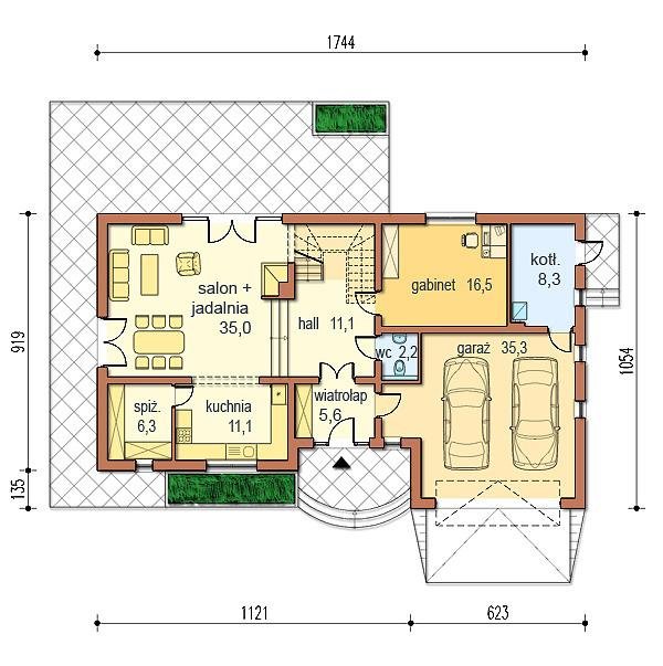 Część dzienna na parterze składa sie z wiatrołapu, hallu z reprezentacyjną klatką schodową, dużej kuchni i spiżarni, jadalni i przestronnego salonu kominkowego, otwartego na ogród. Oprócz tego na parterze zlokalizowano gabinet, wc, kotłownię i garaż.