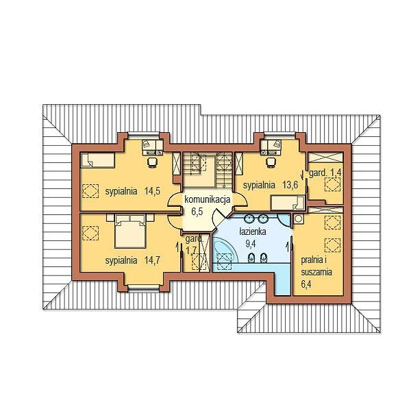 Część nocną na poddaszu tworzą: trzy duże, przestronne i jasne sypialnie, w tym dwie z własną garderobą, wygodna duża łazienka oraz pomieszczenie pralni i suszarni. Centralnie zlokalizowana komunikacja jest wygodna, a klatka schodowa doświetlona oknami połaciowymi.