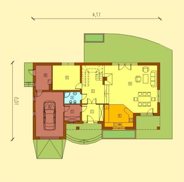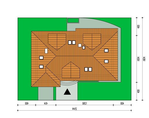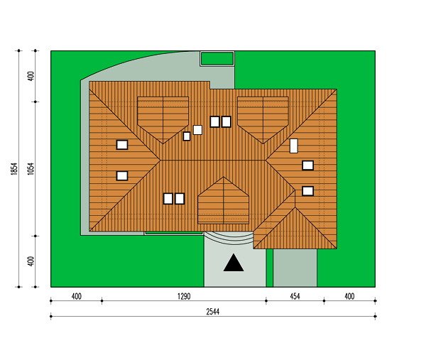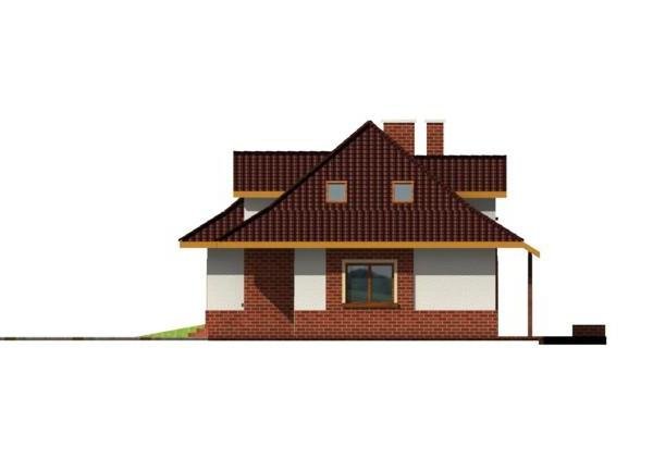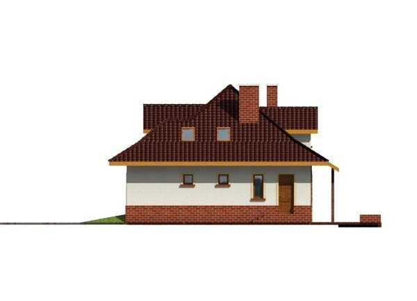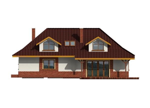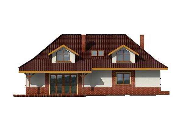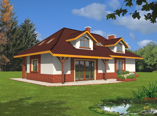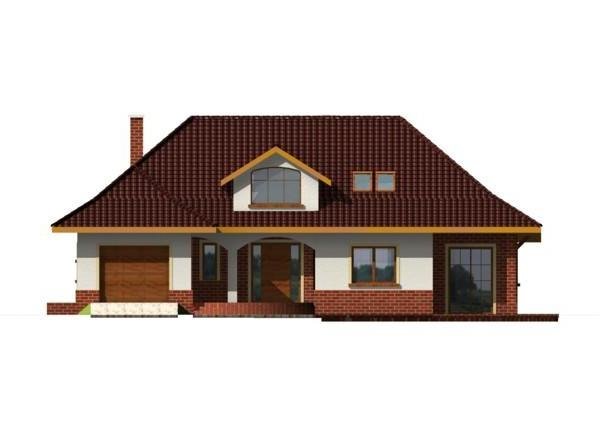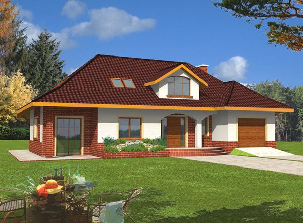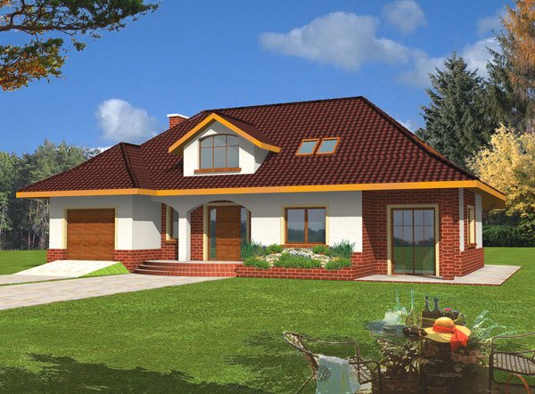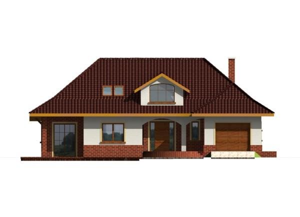 Dom posiada prosty układ - główna część domu na planie prostokąta z wysunietym garażem. Bryła domu jest zwarta i mało skomplikowana, przekryta czterospadowym dachem z wysuniętą częścią nad garażem. Konstrukcja dachu nie jest skomplikowana, a lukarny z dużymi oknami dodają domowi uroku.