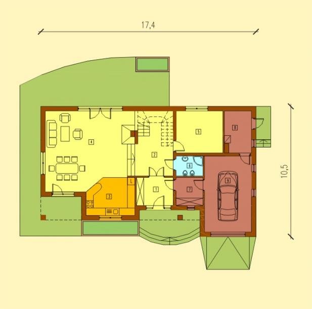 Część dzienna na parterze składa sie z wiatrołapu, hallu z reprezentacyjną klatką schodową, dużej kuchni, jadalni i przestronnego salonu kominkowego, otwartego na ogród. Oprócz tego na parterze zlokalizowano gabinet, łazienke, kotłownie, garaż i pomieszczenie gospodarcze.
