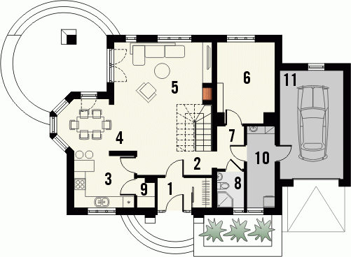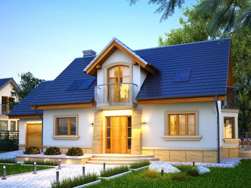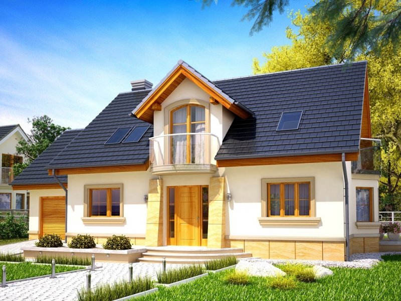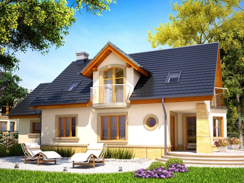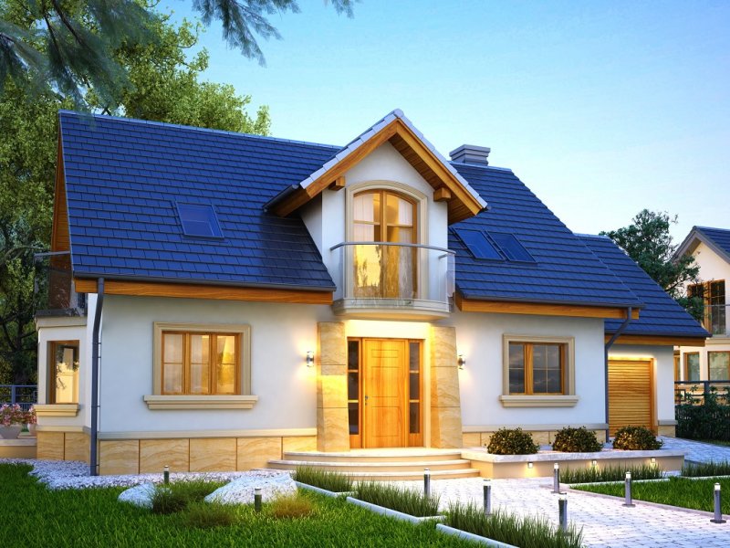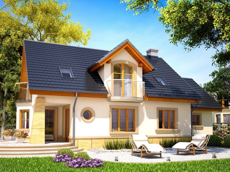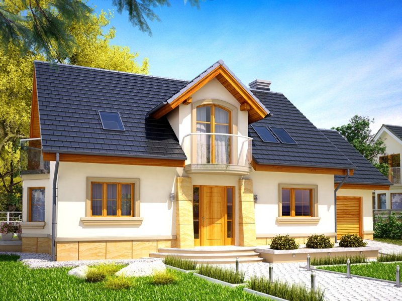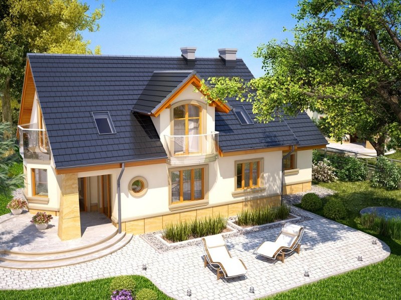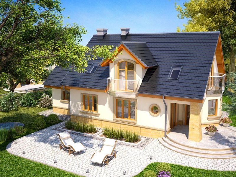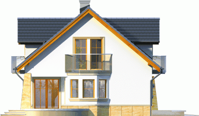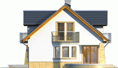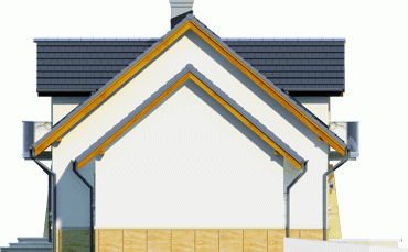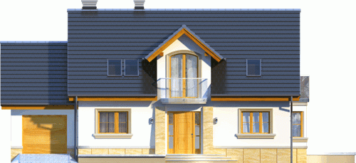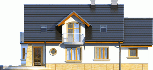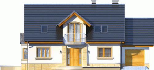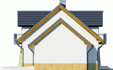 Atrakcyjny dom o bryle głównej przykrytej dachem dwuspadowym. Budynek z reprezentacyjnie podkreślonym wejściem. Część tarasu od ogrodu osłonięta ładnym i praktycznym podcieniem.