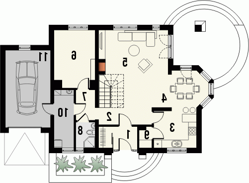 Budynek niepodpiwniczony, piętrowy z garażem lub bez. Na parterze obok pokoju dziennego i otwartej kuchni ze spiżarnią znajduje się dodatkowy pokój, łazienka i pomieszczenie gospodarcze. Na poddaszu pod dachem stromym zaprojektowano 3 sypialnie i łazienkę. Dokumentacja dostępna również w odbiciu lustrzanym.
