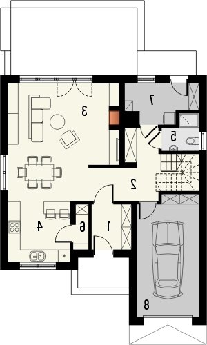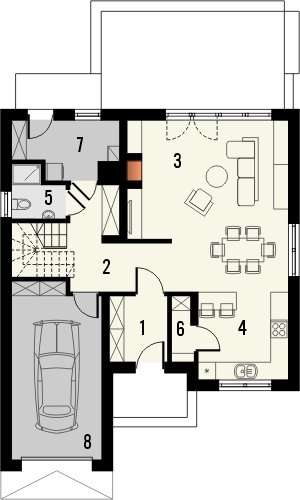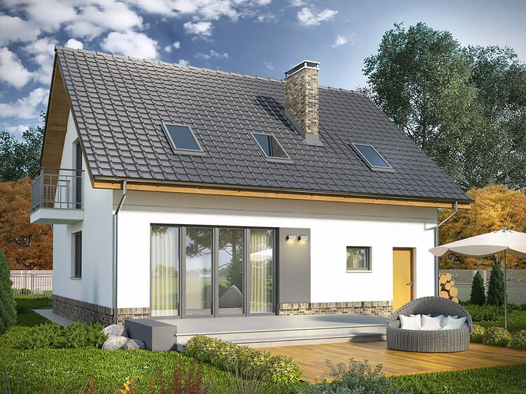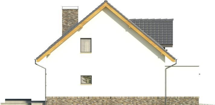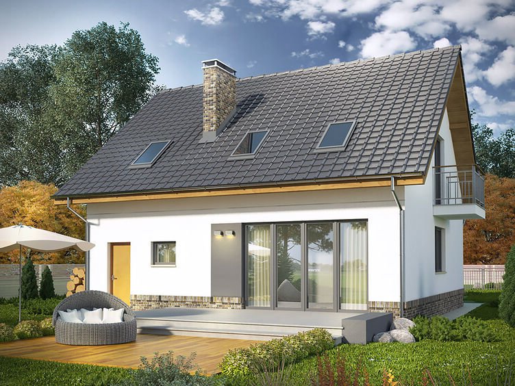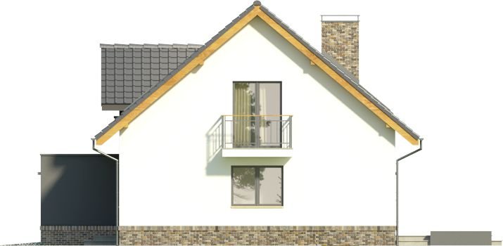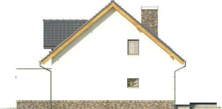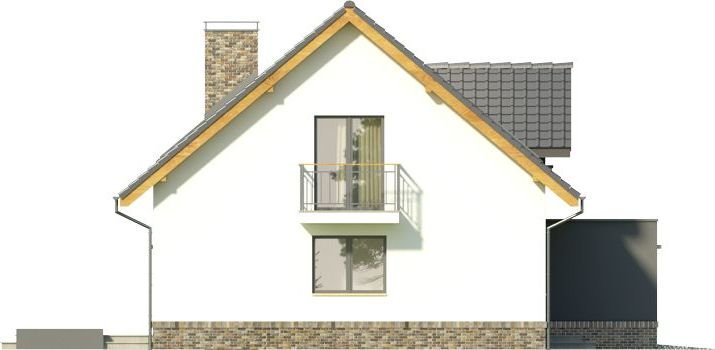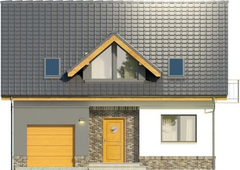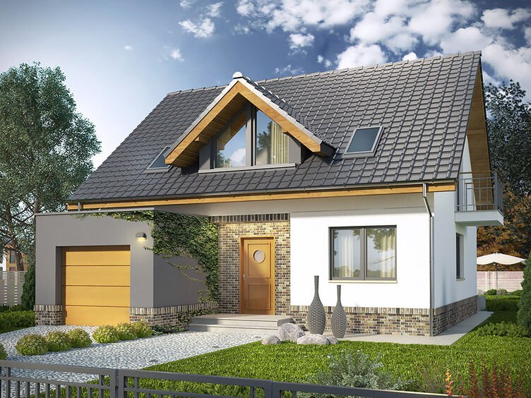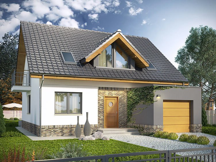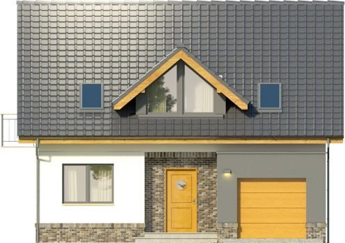 Prosty i tani budynek wolnostojący z wysuniętym lekko do przodu garażem jednostanowiskowym.