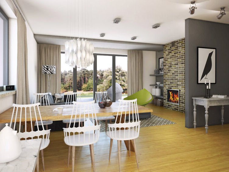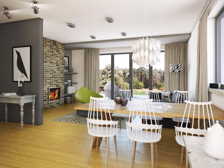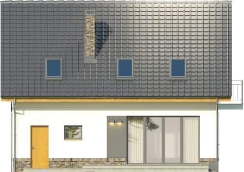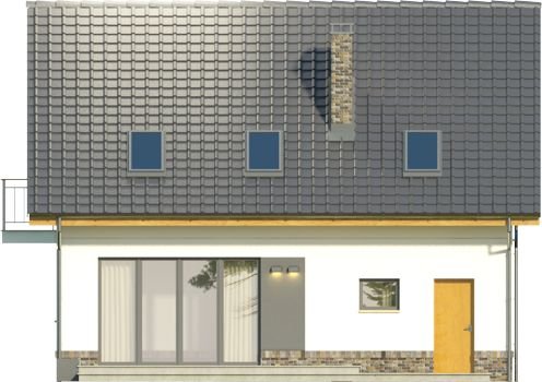 Dom ten proponujemy wybudować przy użyciu następujących materiałów: bloczki gazobetonowe, ocieplenia ze styropianu i wełny, strop Teriva, drewniana więźba pokryta dachówką, tynki zewnętrzne strukturalne na siatce, płytki klinkierowe na okładziny fragmentów ścian oraz okna drewniane lub z profili PVC.