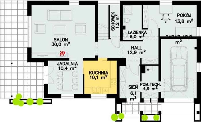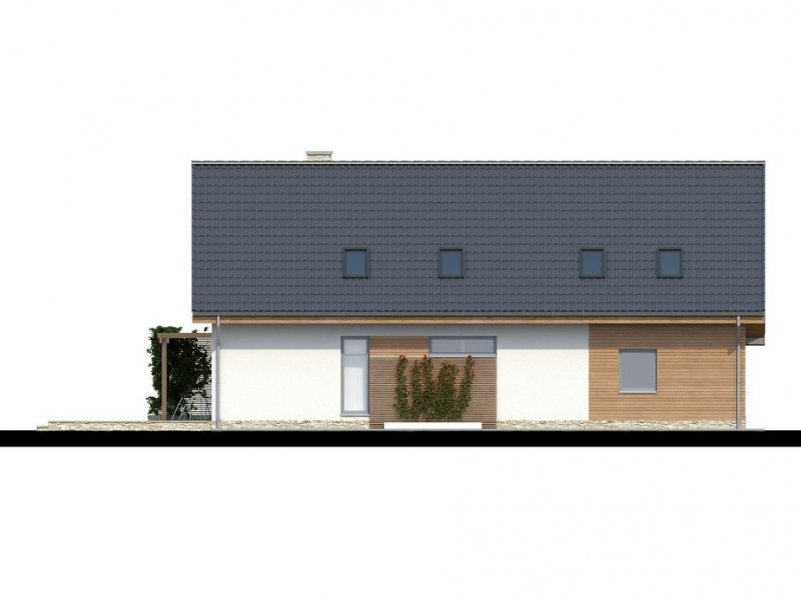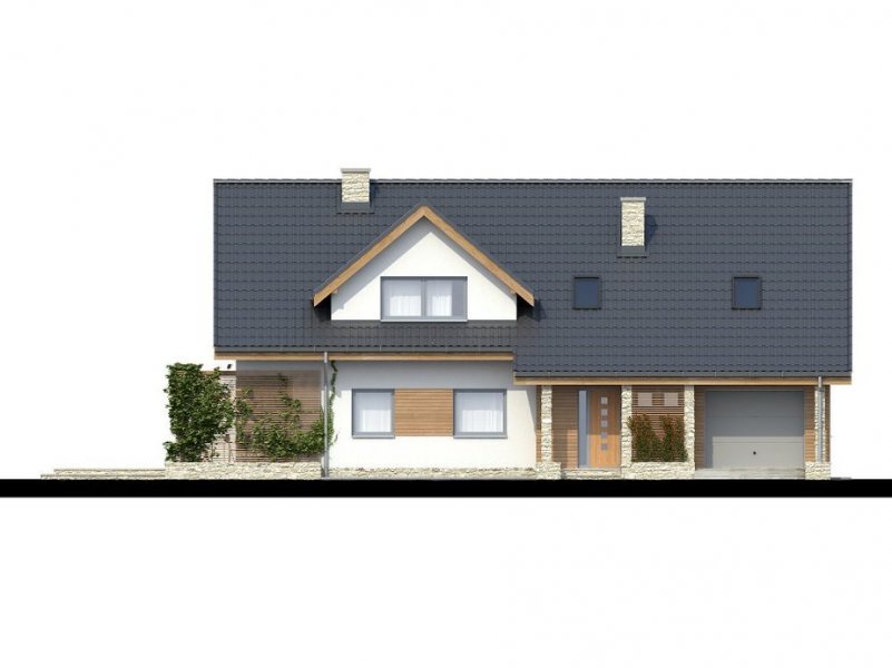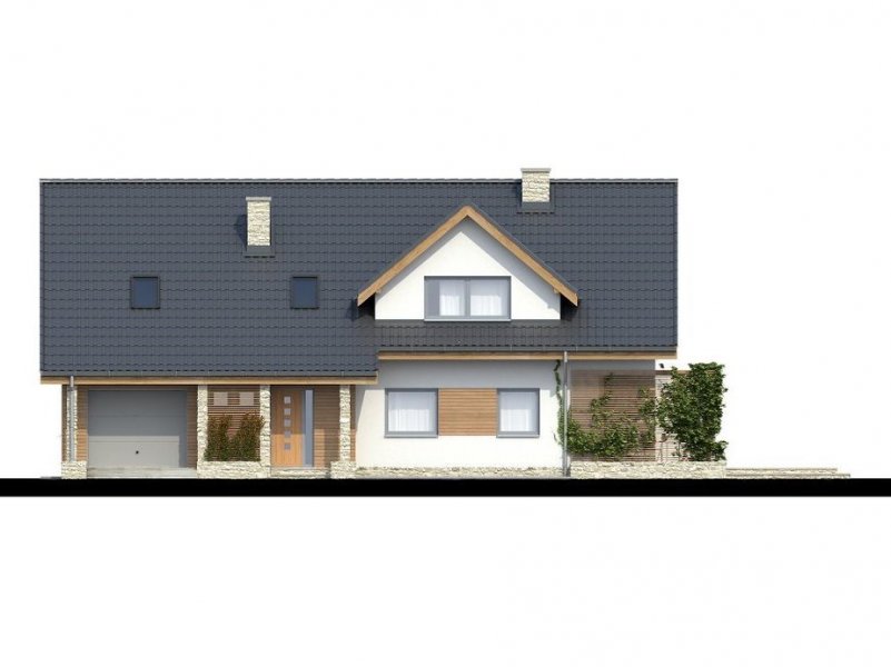 Wygodny dom dla dużej rodziny. Posiada cztery sypialnie na poddaszu oraz pokój na parterze mogący służyć jako dodatkowa sypialnia lub gabinet. Na poddaszu zlokalizowano łazienkę oraz pralnię. Parter to duży salon kuchnia i jadalnie wydzielone przesuwanymi drzwiami. Na parterze zlokalizowano również drugą łazienkę pomieszczenia pomocnicze oraz garaż. Całości dopełniają nowoczesne w wyrazie elewacje.