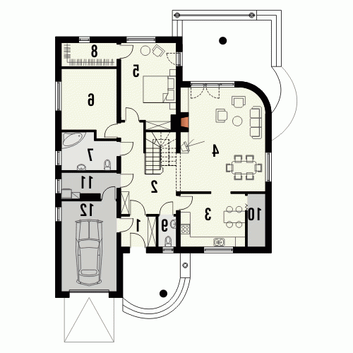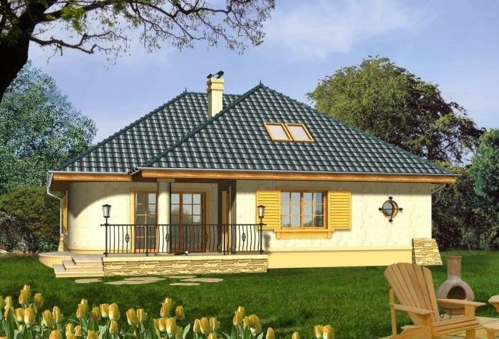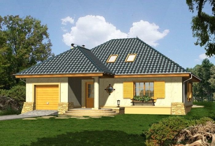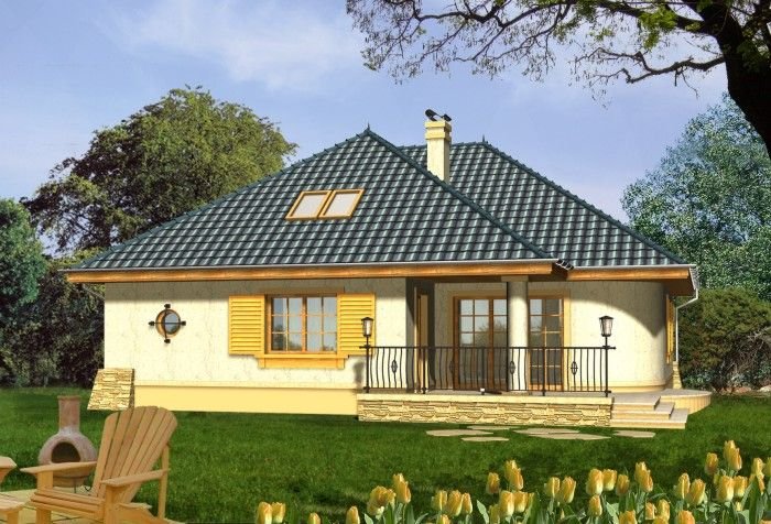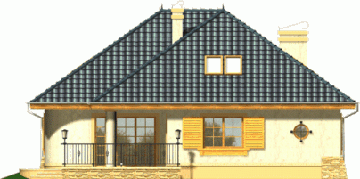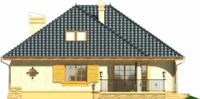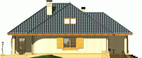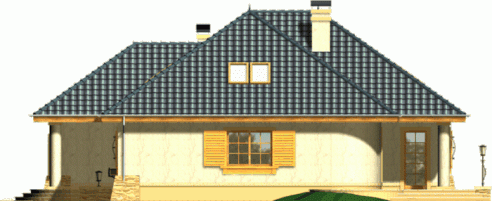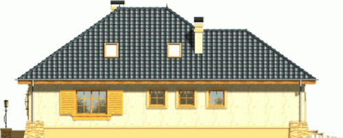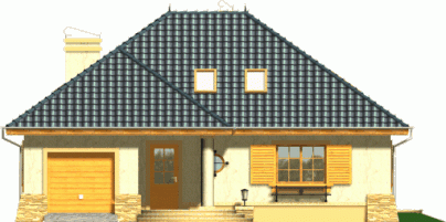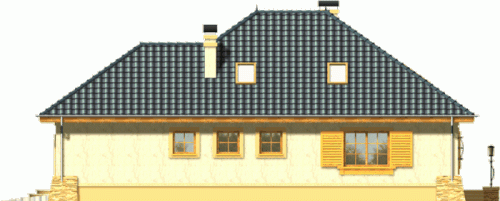 Budynek niepodpiwniczony piętrowy z wbudowanym garażem jednostanowiskowym. Na parterze obok salonu z kominkiem, kuchni ze spiżarnią zaprojektowano także dwa pokoje z łazienką, pomieszczenie gospodarcze i garaż. Na piętrze (poddasze możliwe ew. do późniejszego wykończenia) pod dachem kopertowym zaprojektowano 2 sypialnie i łazienkę. Dokumentacja dostępna również w odbiciu lustrzanym.