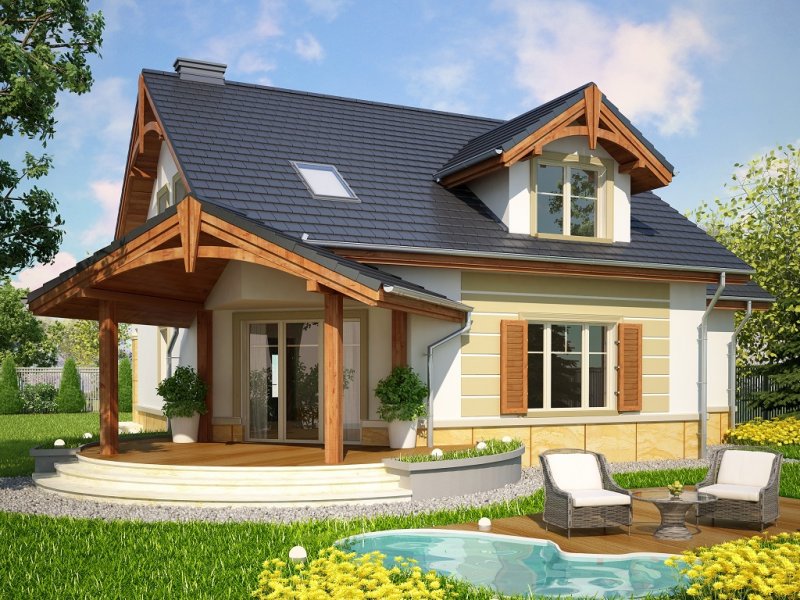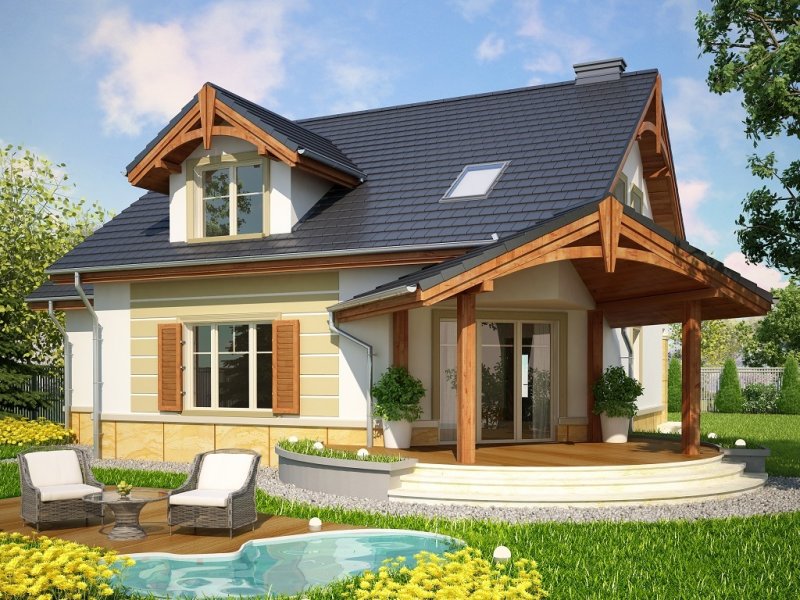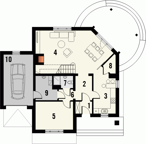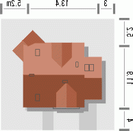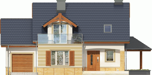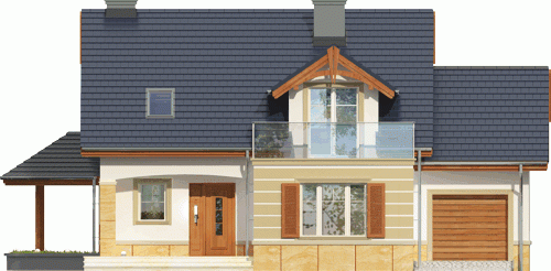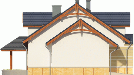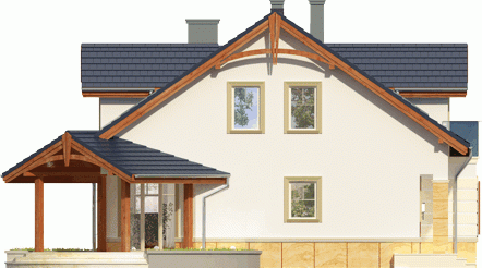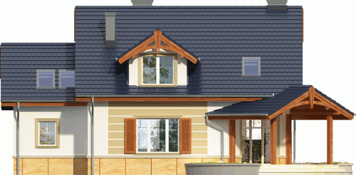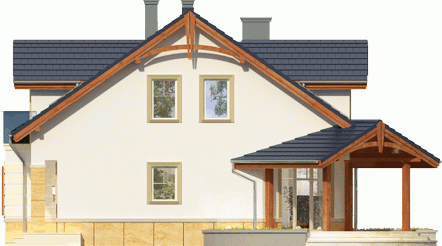 Bardzo ciekawy dom o bryle głównej przykrytej dachem dwuspadowym. Strefa wejściowa osłonięta ładnym i praktycznym podcieniem. Od strony ogrodu atrakcyjnie zadaszony owalny taras.
