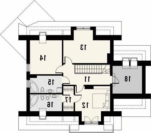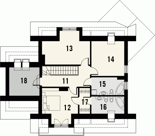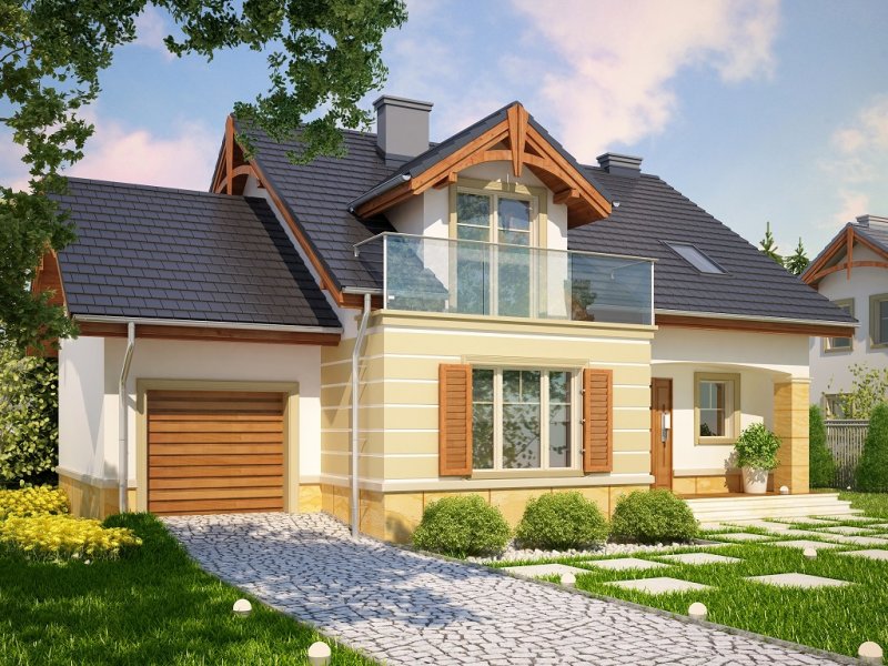 Nowa, nowocześniejsza wersja popularnego projektu domu Wenecja. Budynek niepodpiwniczony, piętrowy z garażem lub bez. Na parterze obok pokoju dziennego i kuchni ze spiżarnią znajduje się dodatkowy pokój, łazienka i pomieszczenie gospodarcze. Na poddaszu pod dachem stromym zaprojektowano 3 sypialnie, w tym jedną z własną garderobą i łazienką, oraz dostępną z hallu łazienkę i strych (lub dodatkowy pokój). Dokumentacja dostępna również w odbiciu lustrzanym.