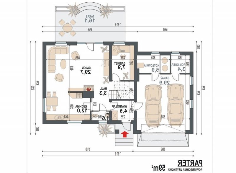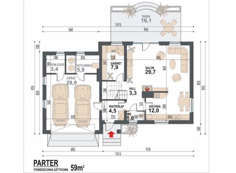 * na parterze zaprojektowano przestronny salon z kominkiem i gabinetem lub do dowolnej aranżacji, np.: biblioteczką lub dodatkową sypialnię, kuchnię z aneksem jadalnym, wc, hall, wiatrołap, kotłownię ,pomieszczenie gospodarcze oraz garaż