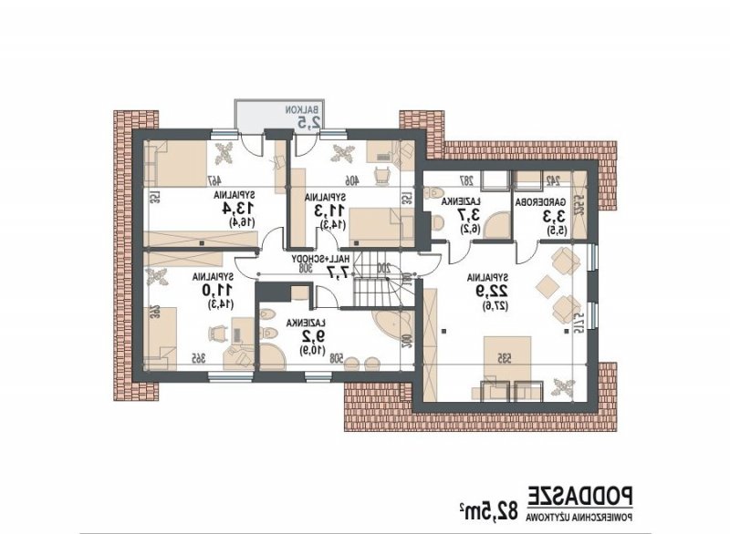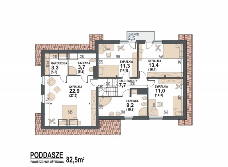 * na poddaszu użytkowym zaprojektowano 4 sypialnie oraz dwie łazienki w tym jedną dostępną z sypialni rodziców i garderobę