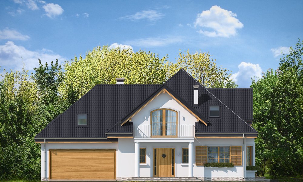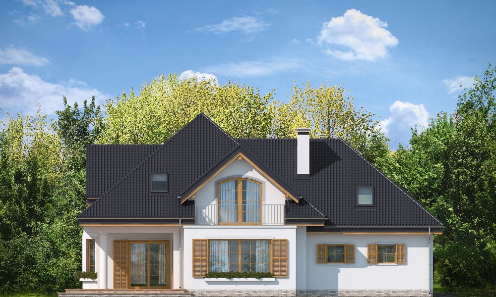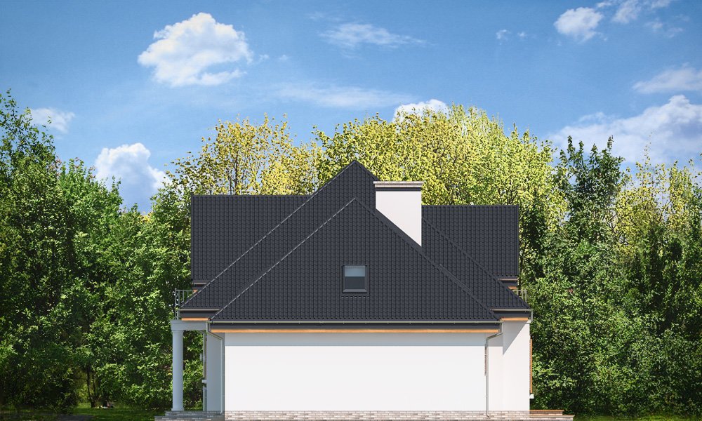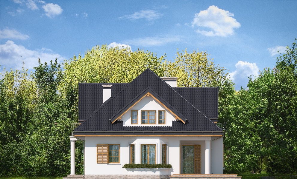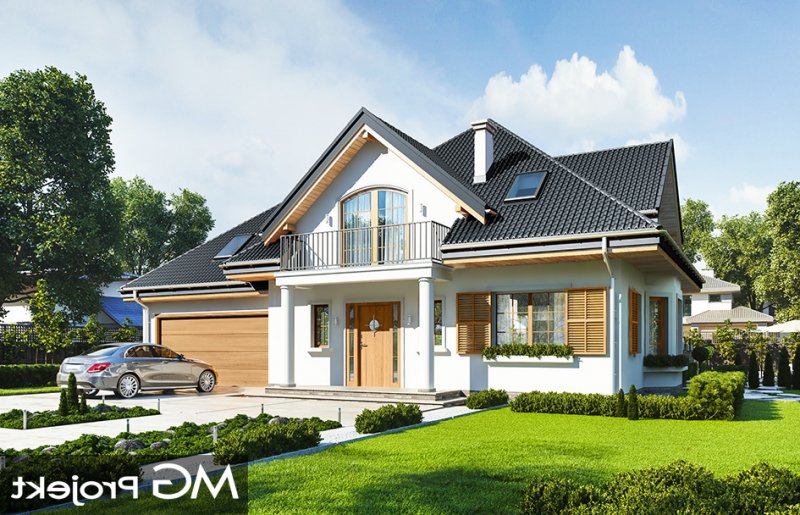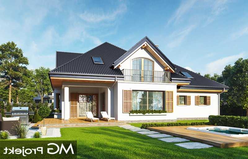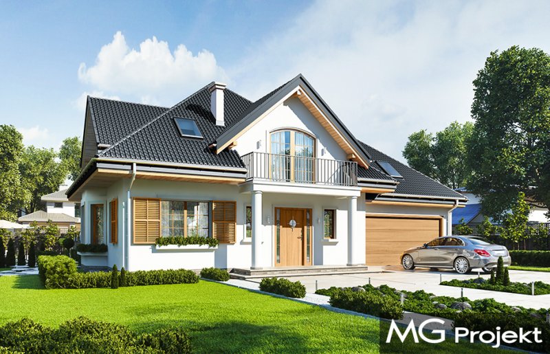 Willa Julia 2 jest jednym z dwóch najnowszych wersji cieszącego się popularnością projektu Julka. Domy są bardzo podobne do swojego pierwowzoru, pozmieniano w nich jednak i usprawniono niektóre rzeczy, wprowadzając rozwiązania Inwestorów budujących wcześniej Julkę. Willa Julia 2 to dom z poddaszem użytkowym, z dobudowaną częścią garażową z obszernym podwójnym garażem. Dom łączy w sobie nowoczesne materiały, detale i technologie, z klasyczną tradycyjną formą. Czterospadowy dach urozmaicony szerokimi lukarnami, w połączeniu ze ścianami tworzy proporcjonalny budynek o właściwej skali. Do budynku wchodzimy przez podcień wejściowy z balkonem na poddaszu, z kolumnami po bokach. Przez szerokie drzwi z naświetlami przechodzimy do wnętrza. Elewacja ogrodowa ozdobiona jest lukarną z balkonem, wykuszem salonu z pięknym dużym oknem, oraz podcieniem w narożniku budynku, zadaszającym część tarasu. Czarny dach i białe elewacje nadają budynkowi czystości i nowoczesnego wyrazu. We wnętrzu zaprojektowano na parterze dużą otwartą przestrzeń dzienną, z salonem, jadalnią, holem z wyeksponowanymi schodami, oraz kuchnią. Przy przedsionku zmieszczono przydatną szatnię, a po drugiej stronie dodatkowy pokój na parterze – biuro domowe, lub sypialnię gościnną. Pod schodami przechodzimy do dużego podwójnego garażu z dodatkową przestrzenią gospodarczą, oraz kotłowni. Na poddaszu mamy aż cztery pokoje, w tym sypialnię rodziców z garderobą, dużą łazienkę, oraz pralnię –suszarnię. Willa Julia 2 jest budynkiem energooszczędnym, bardzo dobrze ocieplonym, o zwartej bryle. Dom będzie prosty w budowie i niedrogi w późniejszym użytkowaniu. Zapraszamy.