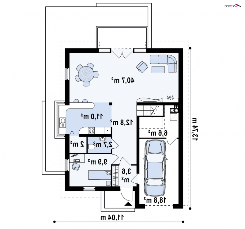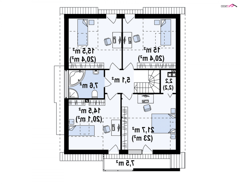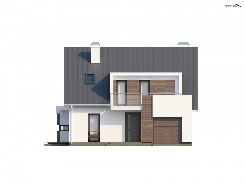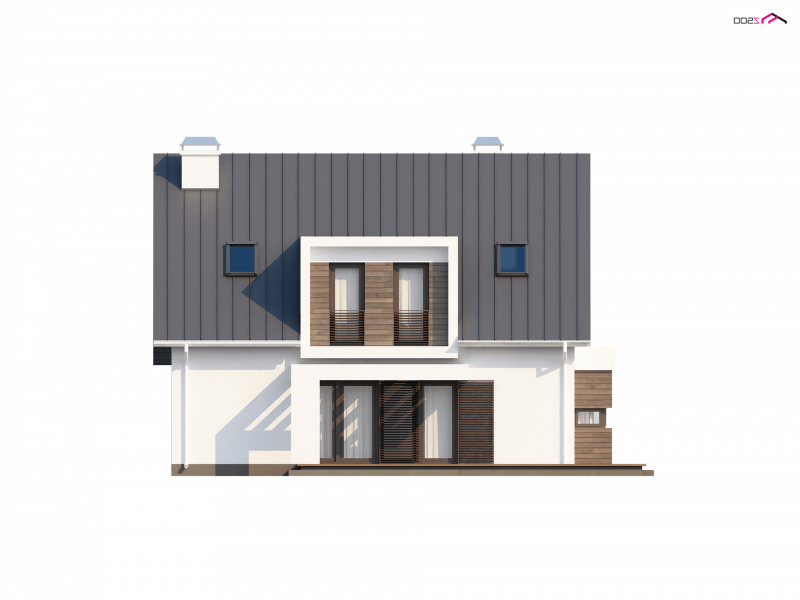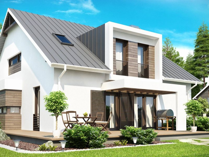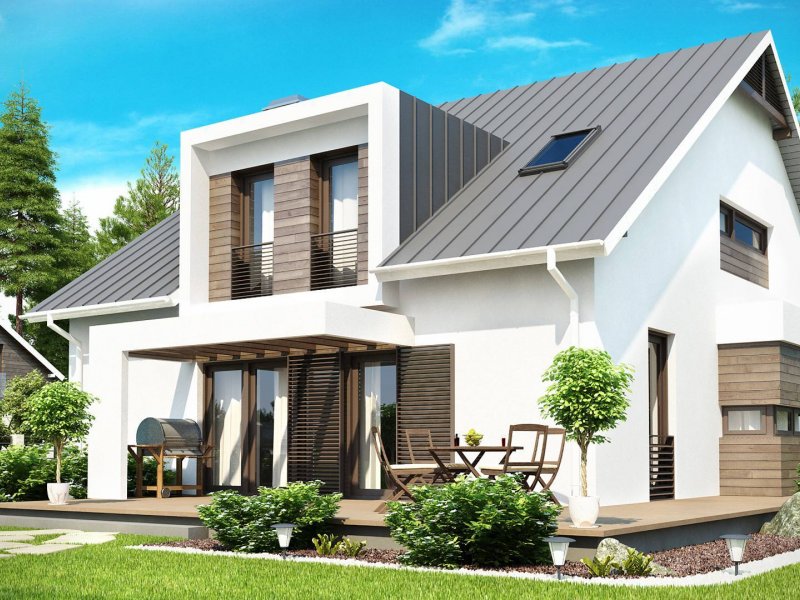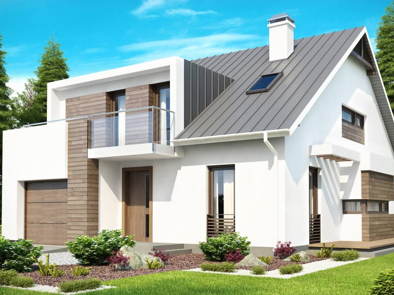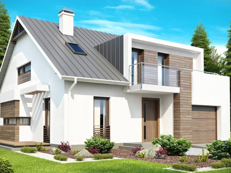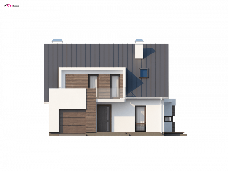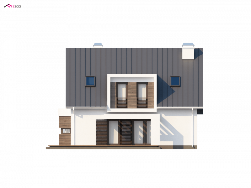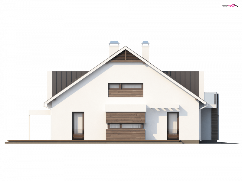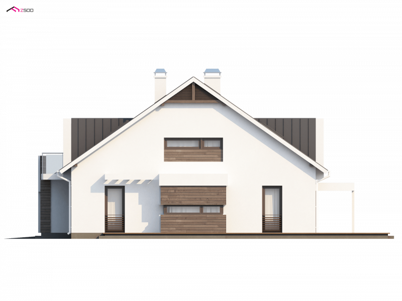 Z116 to niezwykle elegancki i oryginalny projekt domu. Klasyczną bryłę wzbogacono o wykusz i nowoczesne, prostoką lukarny. Jasny tynk elewacji doskonale współgra z ciemnym drewnem.