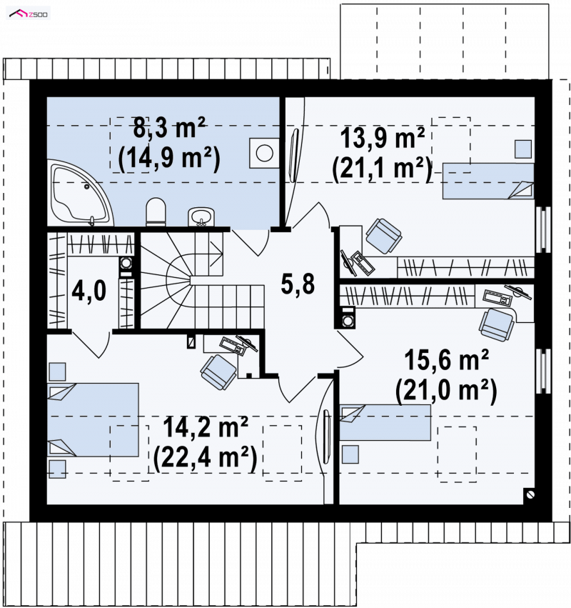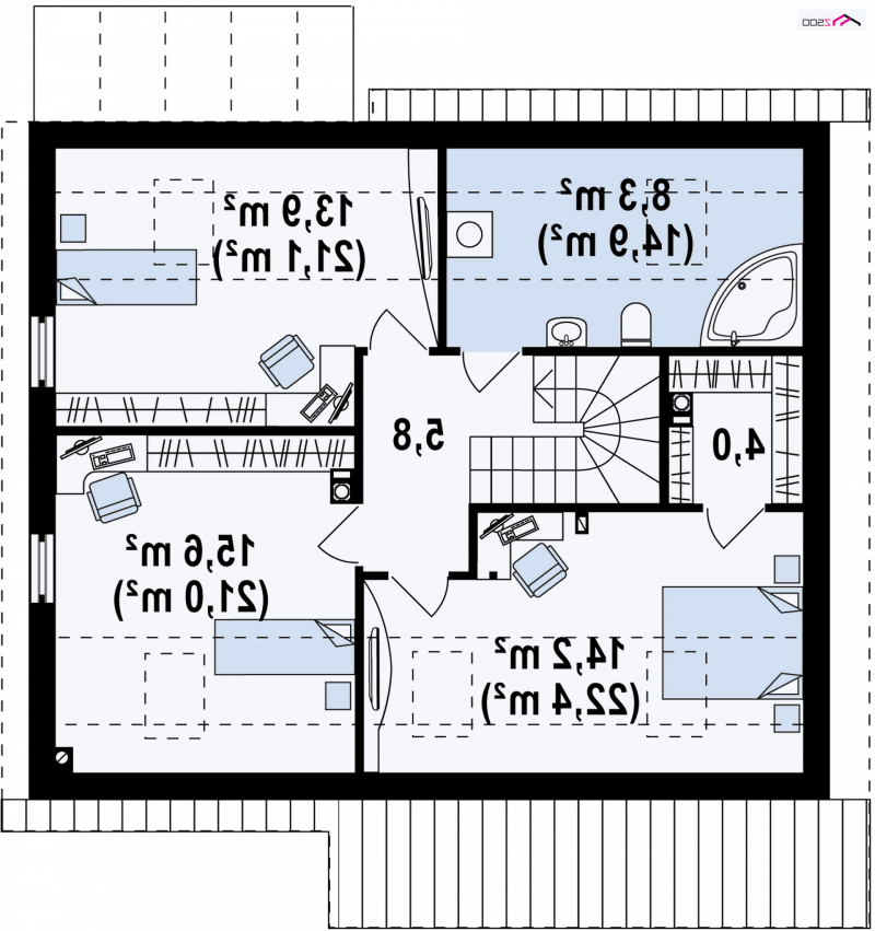 Kluczową częścią projektu Z148 jest duży, przestronny salon. Dzięki szczególnym wymiarom posiada dodatkową strefę przeznaczoną na jadalnię. Centralnie usytuowany kominek z łatwością otuli ciepłem wszystkie pomieszczenia. Wyjście z salonu prowadzi do przydomowej oranżerii. Pomieszczenie zostało stworzone z myślą o miłośnikach roślin i osobach lubiących przebywać w ich otoczeniu. Przestronna kuchnia posiada duże okno, z którego widok prowadzi na pięknie urządzony ogród. Podręczna spiżarka pomieści wszystkie domowe przetwory. Na parterze znajduje się także wygodny pokój gościnny oraz komfortowa toaleta. Piętro tworzą trzy przestronne sypialnie. Ich funkcjonalne i wygodne wnętrze gwarantuje prawdziwy wypoczynek. Spora łazienka z powodzeniem zmieści całą, potrzebną ceramikę.