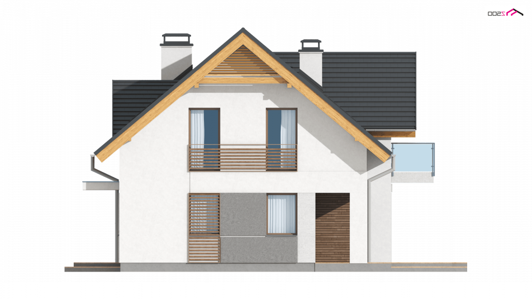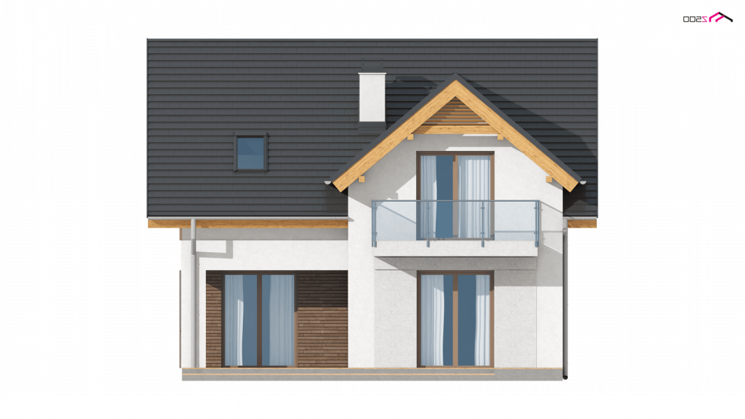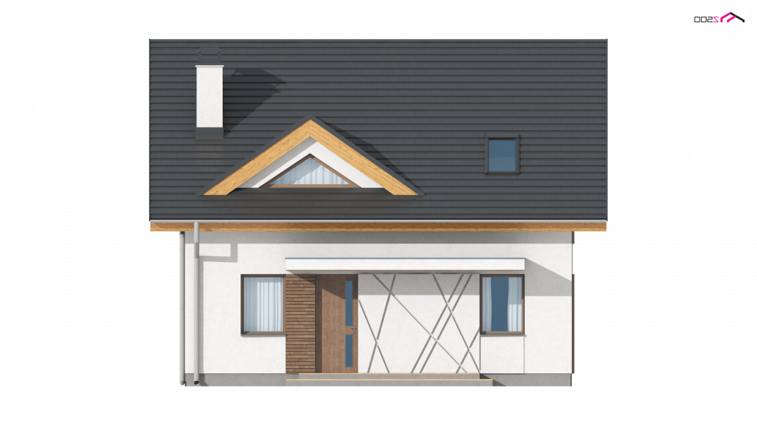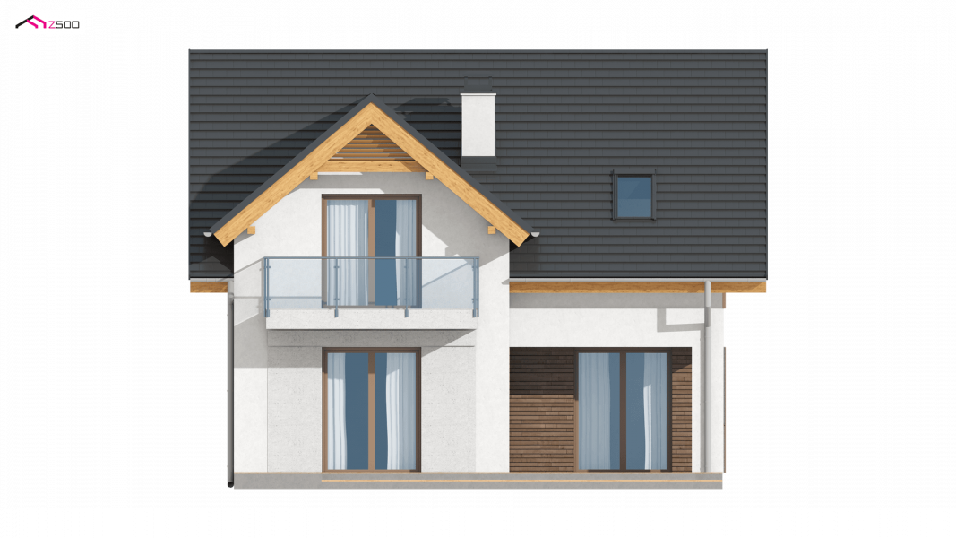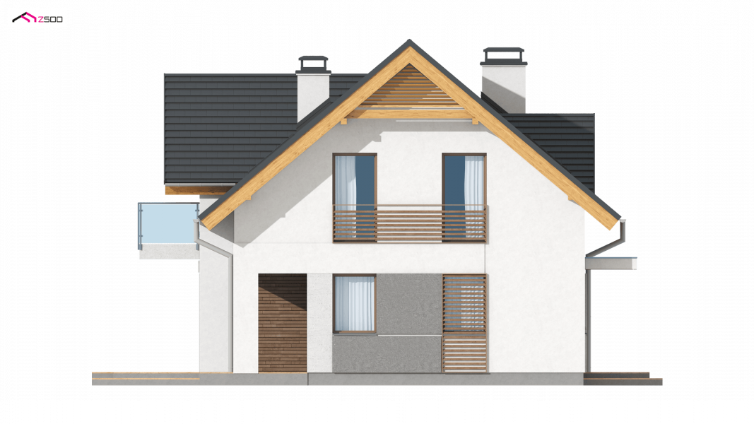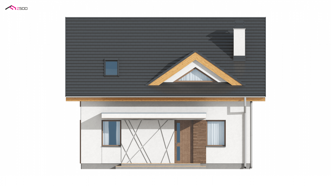 Z163 to mały i funkcjonalny dom z dwuspadowym dachem. Prosta bryłę urozmaica zgrabny wykusz od strony ogrodu oraz lukarna nad wejściem. Ciekawe elementy wykończenia elewacji oraz forma zadaszenia nadają mu elegancji i nowoczesnego stylu.