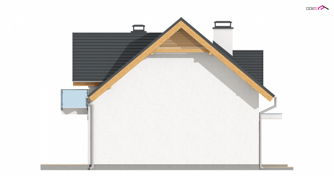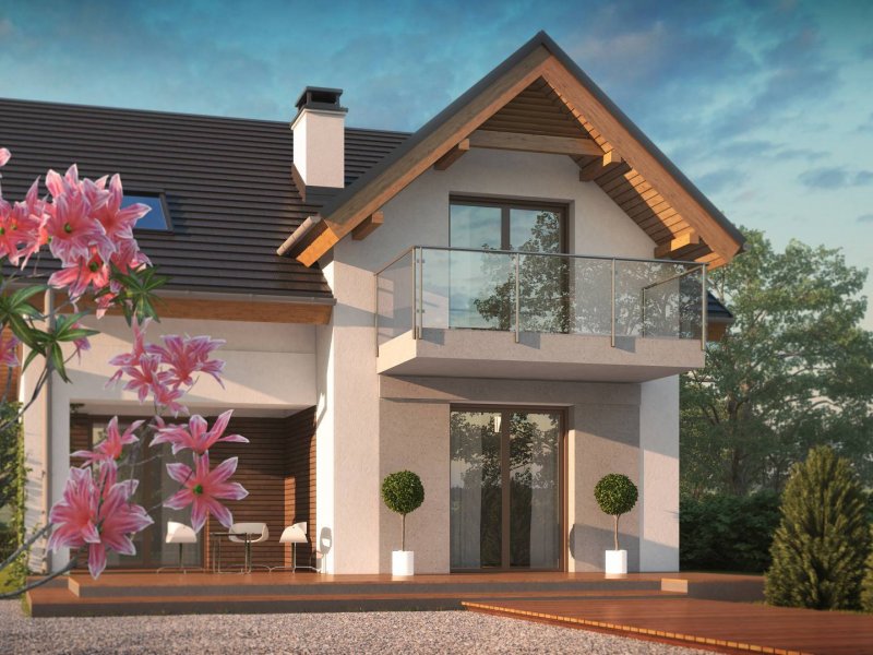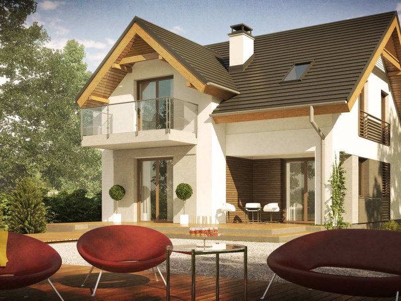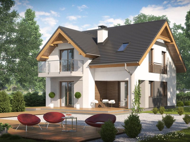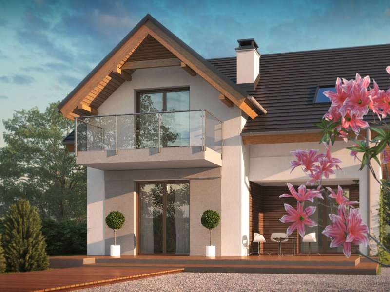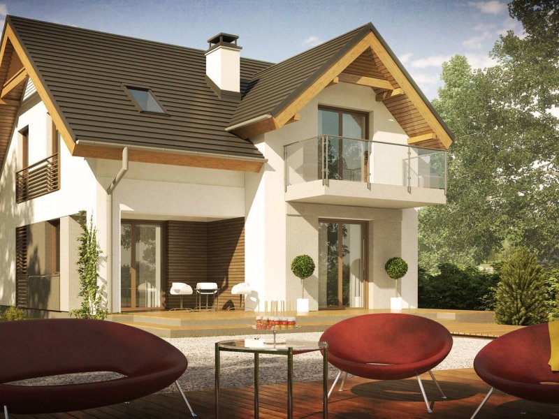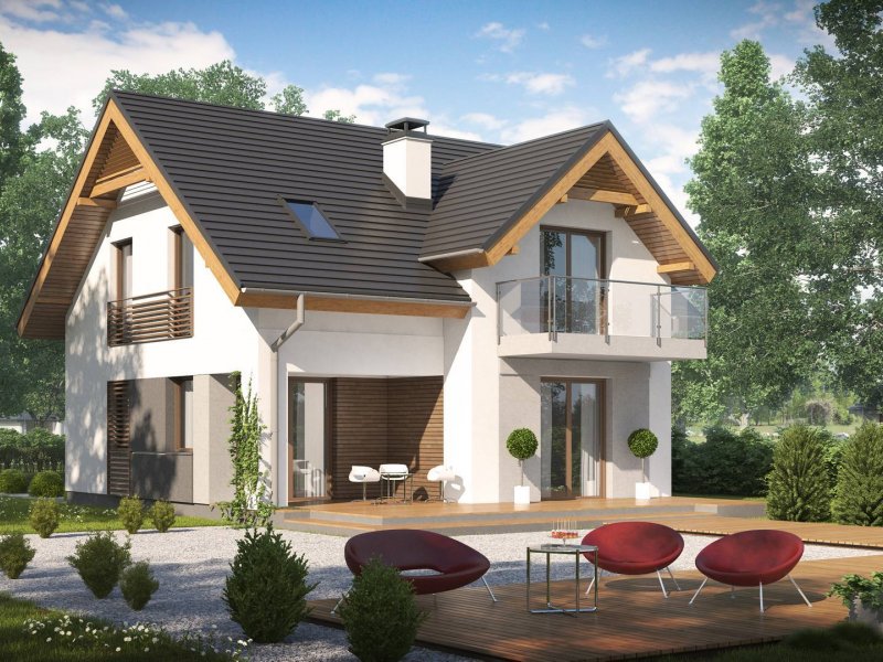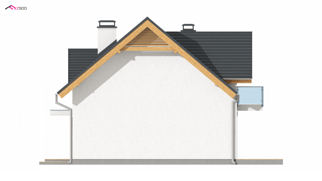 Z163 to mały i funkcjonalny dom z dwuspadowym dachem. Prosta bryłę urozmaica zgrabny wykusz od strony ogrodu oraz lukarna nad wejściem. Ciekawe elementy wykończenia elewacji oraz forma zadaszenia nadają mu elegancji i nowoczesnego stylu.