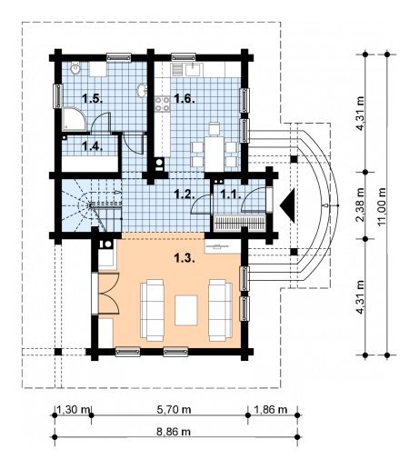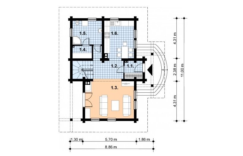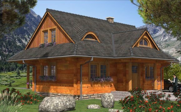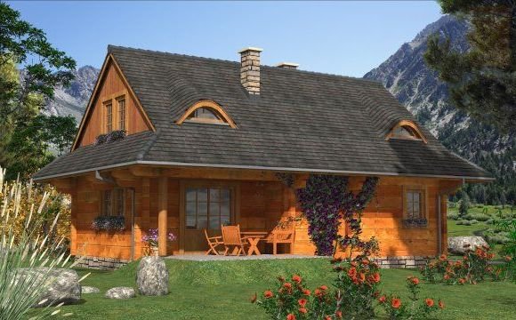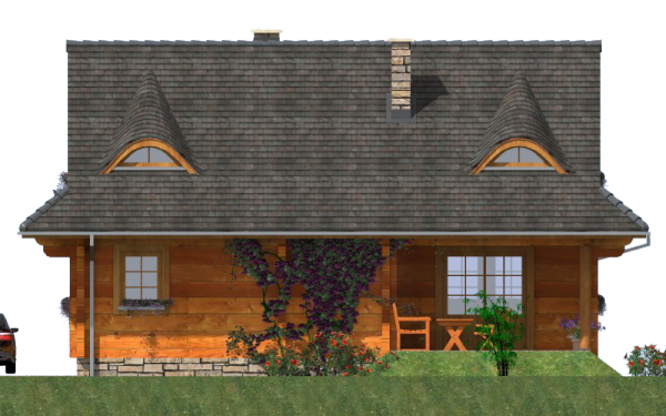 Ściany zewnętrzne: z bali drewnianych gr. 12, 16, 20, 24, 30 cm. ocieplone od wewnątrz wełną mineralną, gr. 52 cm bez ocieplenia
