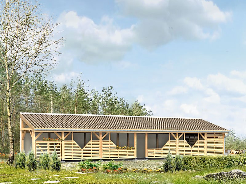 Ściany: drewniane, Stropy: drewniane, Dach: dachówka ceramiczna, kąt nachylenia 17°