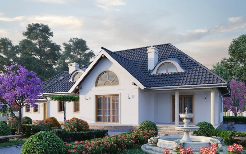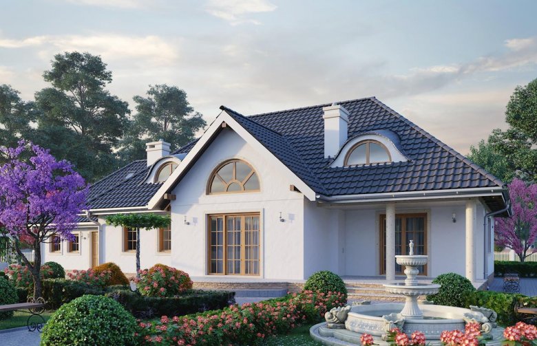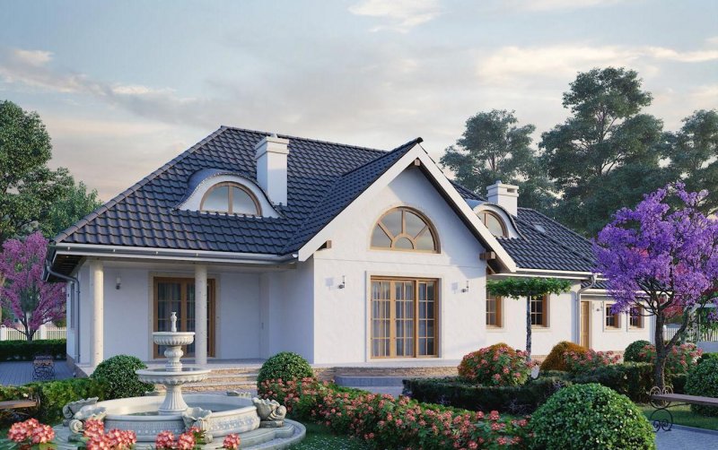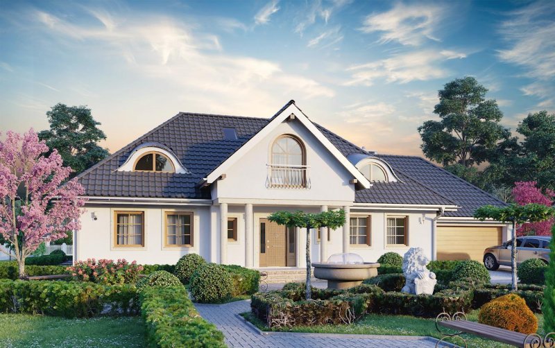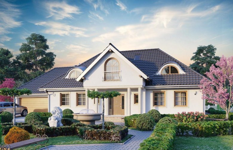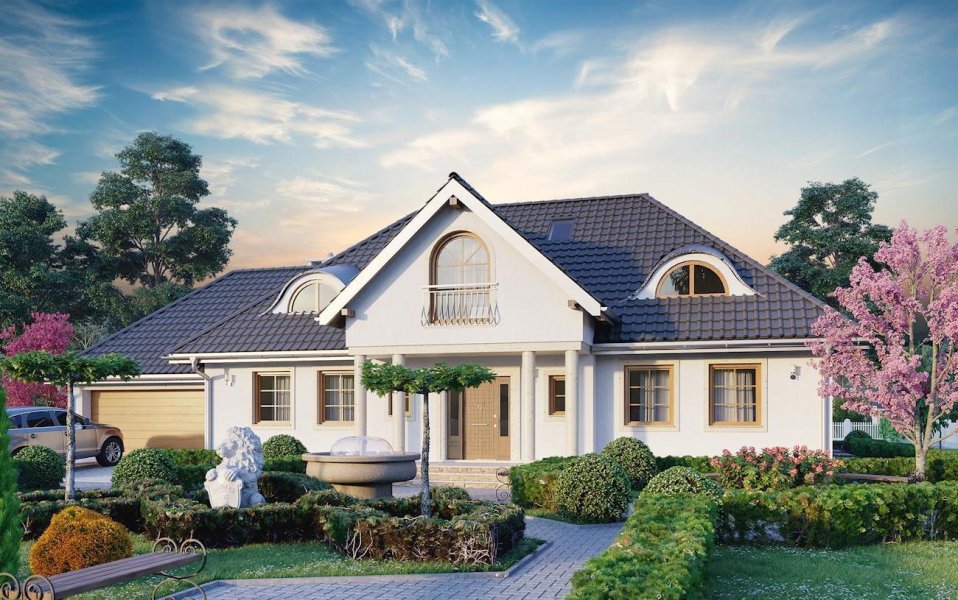 Projekt domu Anielski Dwór to najmniejszy w grupie dużych domów z użytkowym poddaszem Archetonu inspirowanych architekturą dworkową. Od propozycji z Rodziny Aleksandrii odróżnia go większy metraż, dobudowany dwustanowiskowy garaż i swobodniejsza interpretacja historycznego pierwowzoru. Frontowy portyk stał się pretekstem dla podziału i rozbudowy bryły w parterze na trzy części. Główną z nich zajmuje komunikacja z wejściem do gabinetu i salonem wysuniętym w głąb ogrodu. Po lewej stronie znalazła się ogromna kuchnia otwarta na zadaszony taras, a po prawej strefa gospodarcza z łazienką, pralnią, kotłownią i przejściem do garażu. Pod czterospadowym dachem są trzy duże sypialnie i pokój kąpielowy - dostępne z otwartej nad salonem antresoli. Pomieszczenia mają nieodparty urok, ale i niedogodności przestrzeni pod skosami. W projekcie domu Anielski Dwór podcień przy kuchni, fantazyjne wole oka doświetlające poddasze i półkoliste okna w portyku łagodzą rygorystyczny, dworkowy formalizm. Ten wyraźniej widać w nieco większym ale podobnym bryłą i układem funkcjonalnym projekcie domu Ewelina z lukarnami podnoszącymi komfort użytkowania poddasza.