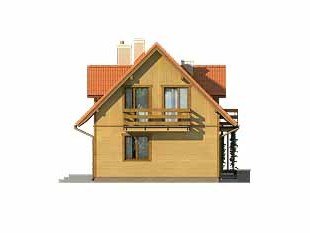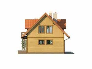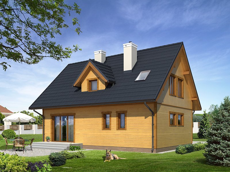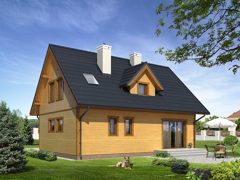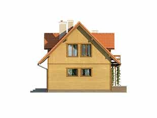 Ściany: szkielet drewniany, Stropy: na belkach drewnianych, Dach: dachówka gontopodobna GERARD CORONA, kąt nachylenia 45°