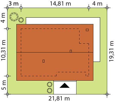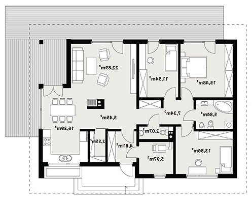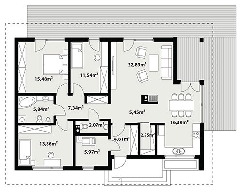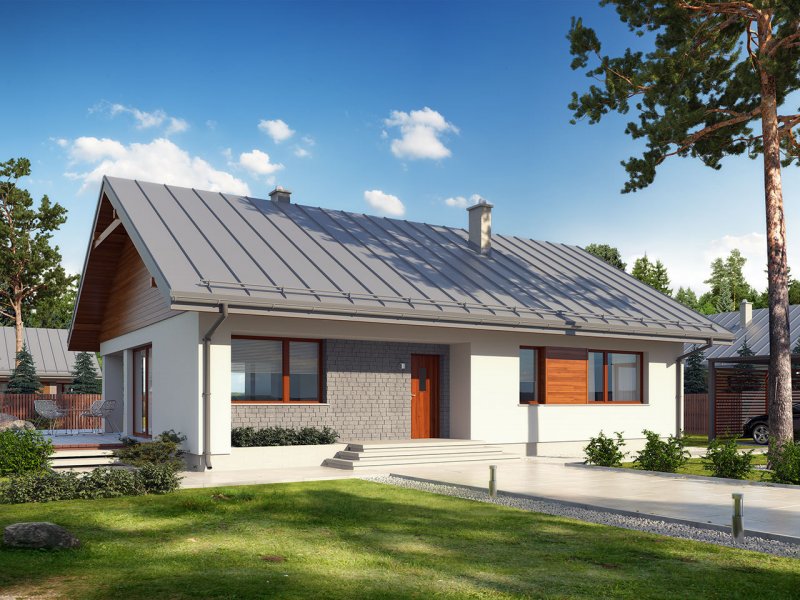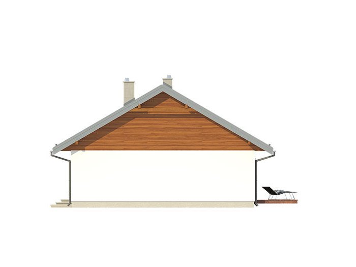 Parterowy dom jednorodzinny, niepodpiwniczony, zaprojektowany w technologii szkieletu drewnianego. Łączy w sobie nowoczesny charakter elewacji z prostym, klasycznym układem pomieszczeń. Jest to bardzo wygodny , prosty i funkcjonalny dom, który swoim pełnym programem zapewnia optymalny komfort 4-osobowej rodzinie. Przestronna część dzienna to duży salon, jadalnia otwierająca się na ogród poprzez ogromne przeszklenie, kuchnia ze spiżarnią oraz wc. Atutem projektu jest zadaszony taras. Tak zaproponowany, ciekawy i przestronny układ pomieszczeń umożliwia szereg aranżacji. Część nocna to 3 wygodne sypialnie, z czego dwie posiadają wyjście na taras oraz przestronna łazienka. W domu zaprojektowano dużą kotłownię dostępną z wiatrołapu, której parametry pozwalają na montaż kotła na każdy rodzaj paliwa, w tym na paliwo stałe. Ten optymalny i ciekawy program funkcjonalny został ujęty w prostej bryle na rzucie prostokąta, przykrytej dwuspadowym dachem. Atutem projektu jest jego prostota zarówno w układzie pomieszczeń jak i w rozwiązaniach elewacji, gdzie elegancki, nowoczesny styl osiągnięto poprzez klasyczne, proste ale szlachetne materiały oraz delikatny, subtelny detal.