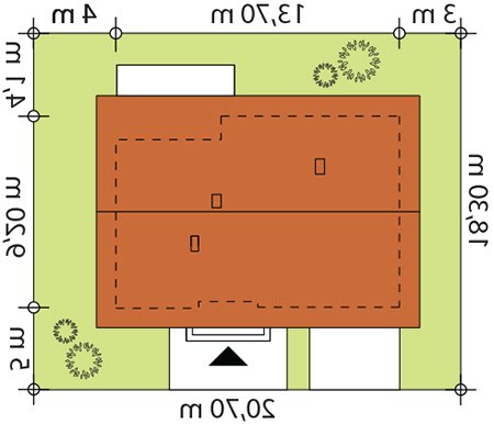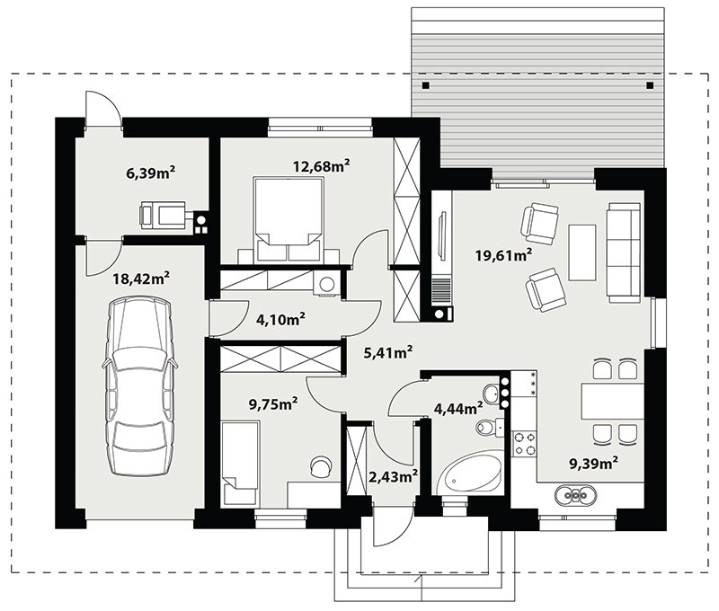 Nieduży jednorodzinny budynek mieszkalny, parterowy, z jednostanowiskowym garażem, zaprojektowany w technologii szkieletu drewnianego. Ergonomiczny i optymalny układ pomieszczeń zapewnia komfort 3-osobowej rodzinie. Funkcjonalnie rozplanowana przestrzeń została wyraźnie podzielona na część dzienną, nocną i gospodarczą. Część reprezentacyjna domu, to przestronny salon połączony z jadalnią, który otwiera się na duży, zadaszony taras oraz kuchnia. Oprócz części dziennej, zaprojektowano dwie sypialnie i łazienkę. Duża kotłownia, garaż oraz pomieszczenie gospodarcze mogące pełnić funkcje spiżarni i pralni przewidziano w części gospodarczej domu. Sama bryła budynku nawiązuje do archetypu domu jednorodzinnego. Rzut budynku powstał w oparciu o rzut prostokąta, zaś sam dom został przykryty dachem dwuspadowym. Dom tym samym jest tani i prosty w budowie oraz niedrogi w utrzymaniu i eksploatacji.