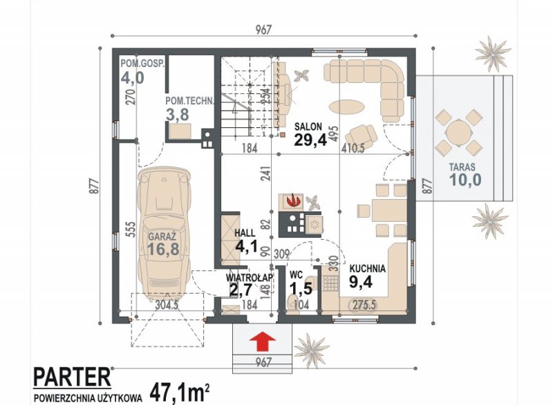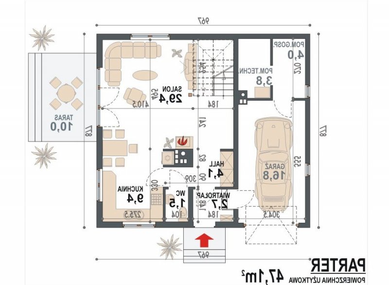 * na parterze zaprojektowano salon z kominkiem i wyjściem na taras, kuchnię z aneksem jadalnym, WC, garaż oraz pomieszczenie gospodarcze i techniczne