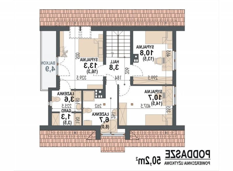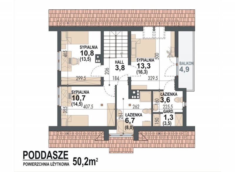 * na poddaszu znajdują się trzy sypialnie i duża łazienka
