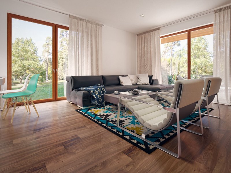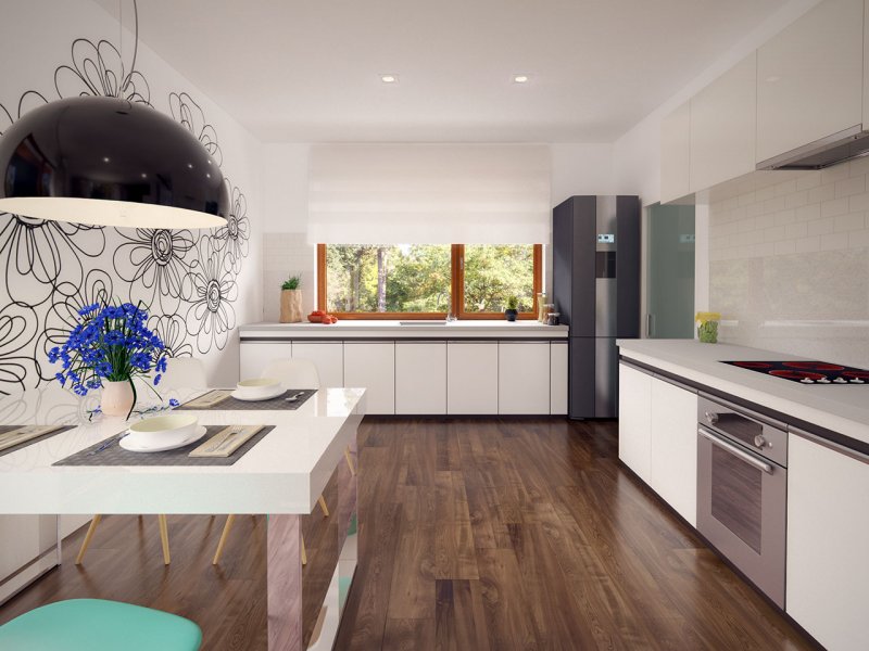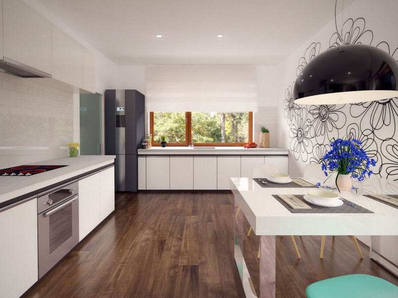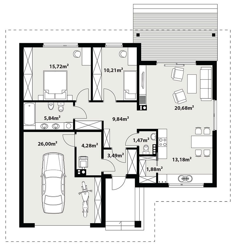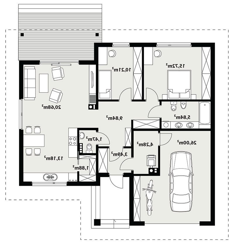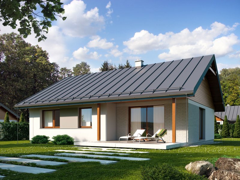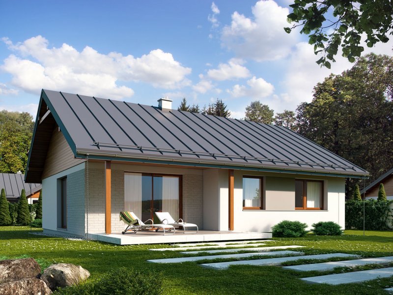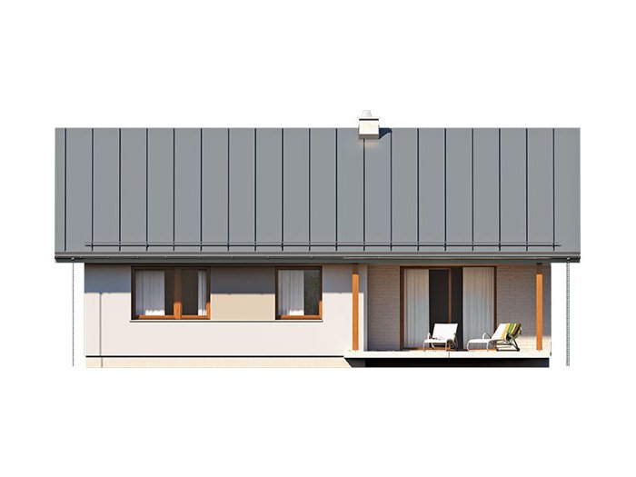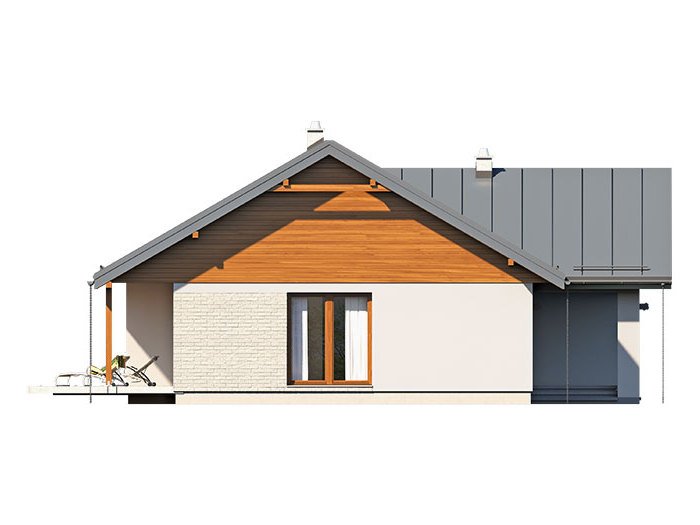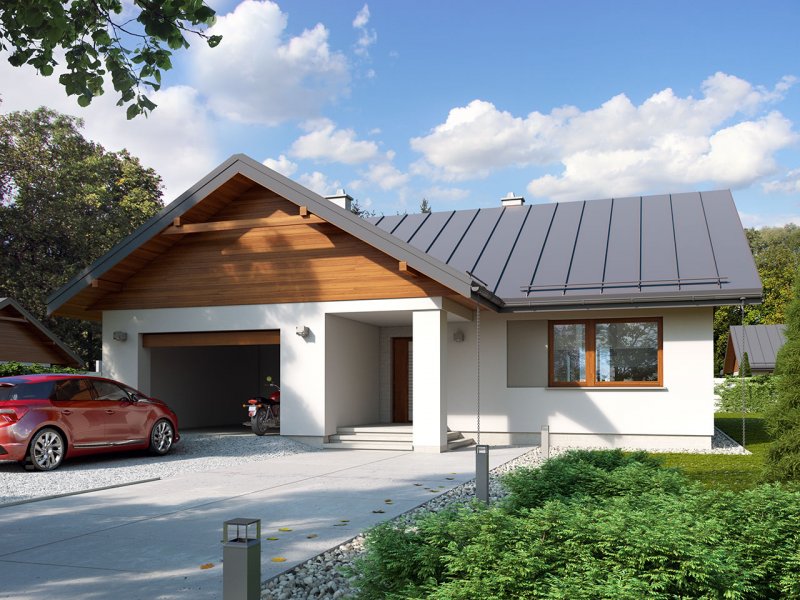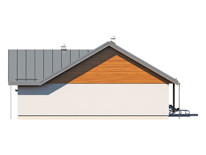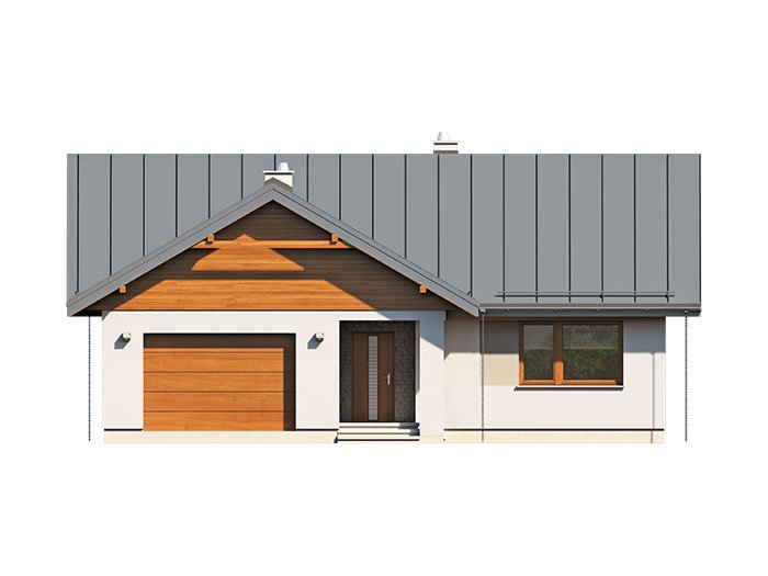 Niko drewniany- to niewielki dom, prosty, funkcjonalny i ekonomiczny w budowie. Jest to propozycja dla osób, które marzą o małym, ale własnym domu. Ten urokliwy dom mieszkalny w technologii szkieletu drewnianego przeznaczony jest dla 3-4 osobowej rodziny. Zaletą tego projektu jest jego program funkcjonalny ujęty w niewielkiej powierzchni użytkowej. Wnętrze zostało rozplanowane w sposób przemyślany, z dbałością o maksymalne wykorzystanie przestrzeni domu. Część reprezentacyjna, to przestronny salon połączony z jadalnią, który otwiera się na duży, zadaszony taras oraz kuchnia ze spiżarnią. Oprócz części dziennej, przewidziano strefę intymną domu, która składa się z dwóch sypialni i łazienki. Dużą kotłownię oraz garaż zaprojektowano w części gospodarczej domu. Wymiary kotłowni umożliwiają montaż kotła na każdy rodzaj paliwa natomiast ciekawie zaprojektowaną wnękę w garażu można wykorzystać jako skład opału bądź pomieszczenie gospodarcze. Niko drewniany stanowi idealne połączenie tradycyjnej bryły z nowoczesnym elewacjami. Geometria rzutu oraz prostota bryły czynią ten dom tanim i prostym w budowie. Jest to idealna propozycja dla rodziny, która ma na uwadze późniejsze koszty utrzymania i eksploatacji domu.