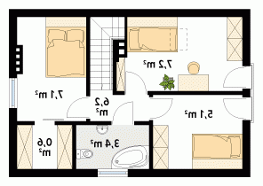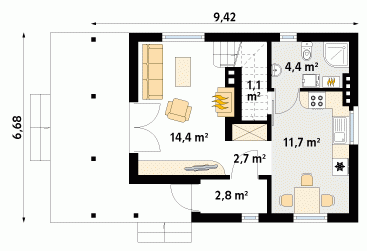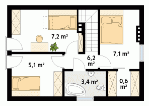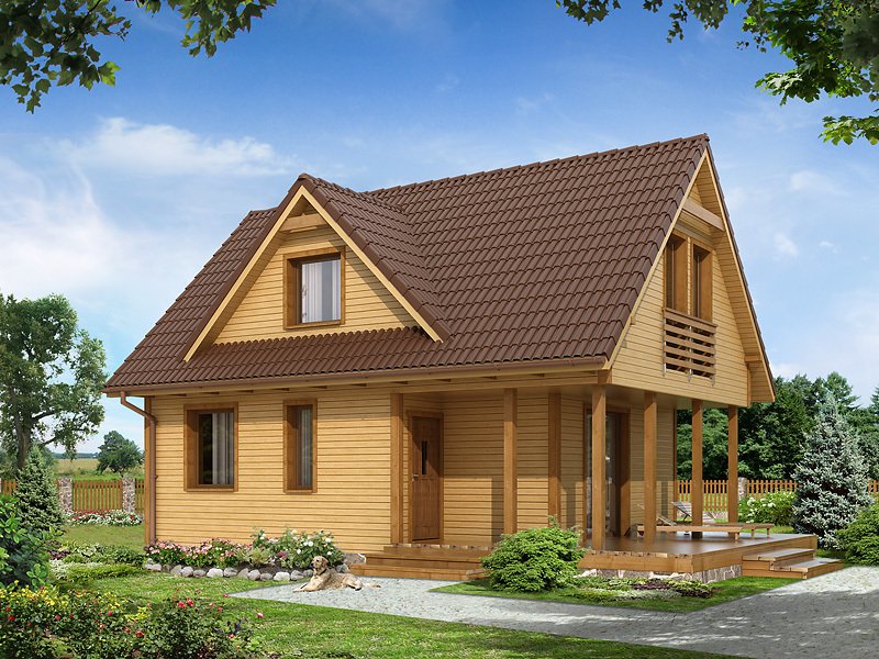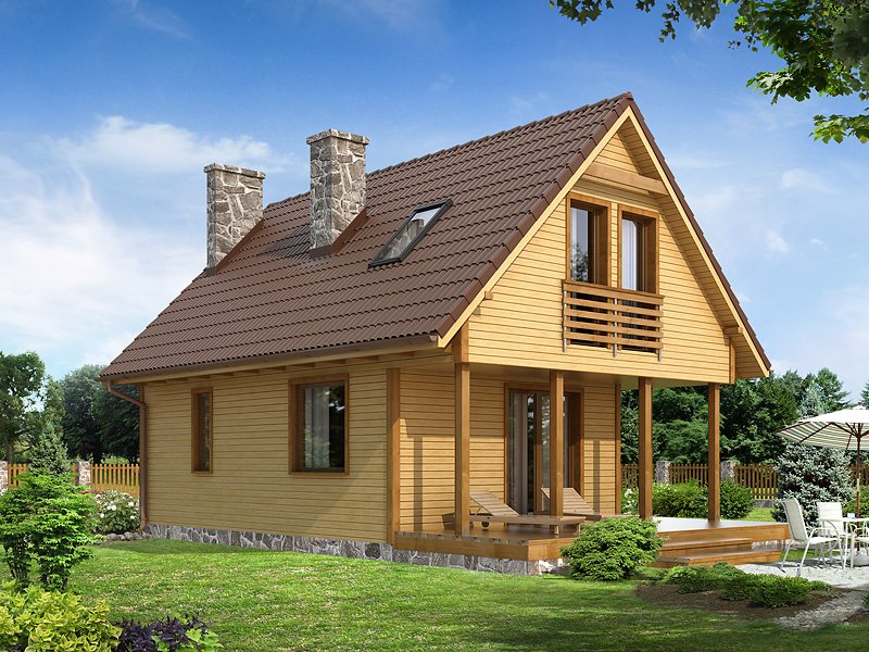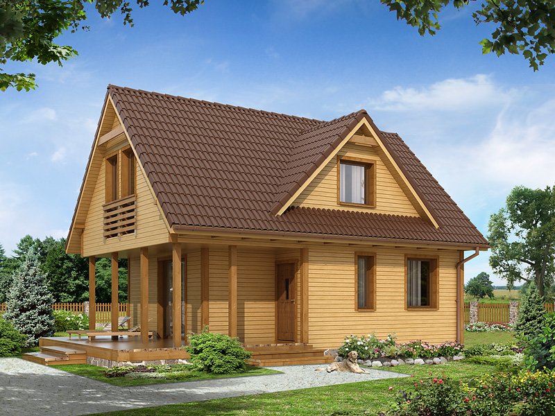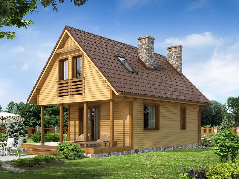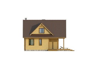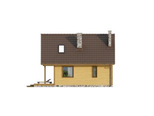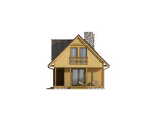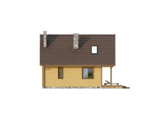Niewielki jednorodzinny dom drewniany. Na parterze znajduje się część dzienna składająca się z salonu z kominkiem, kuchni z jadalnią i łazienki. Przylega do niej zadaszony taras. Na poddaszu trzy sypialnie z łazienką i garderoba tworzą część nocną domu.