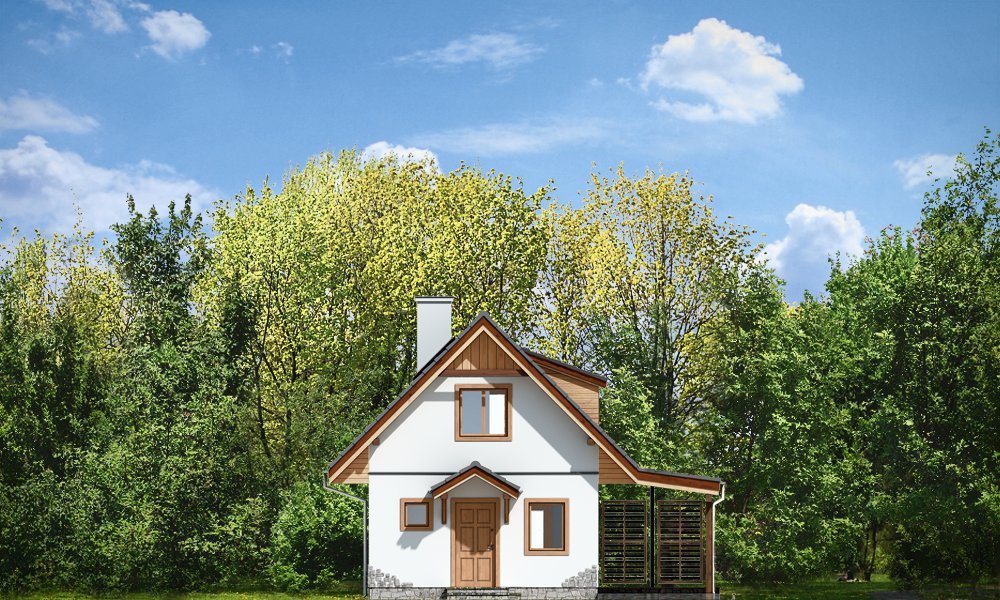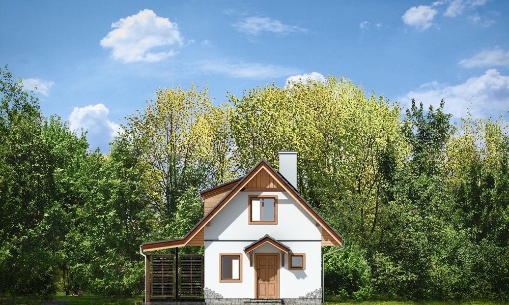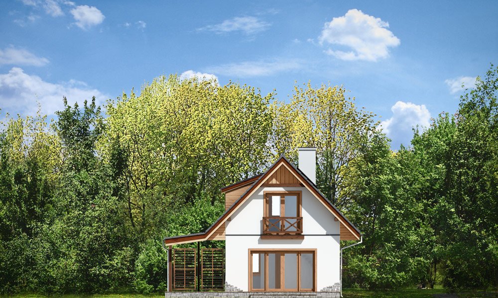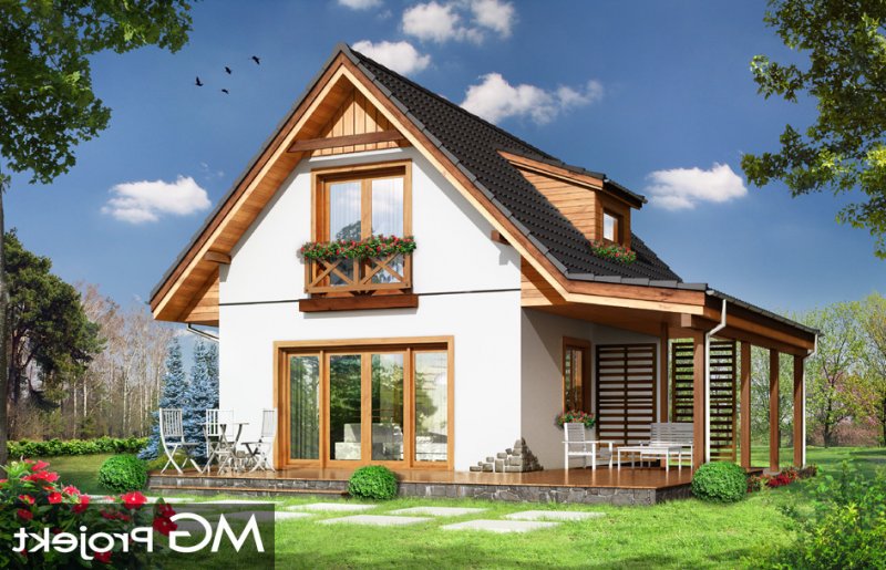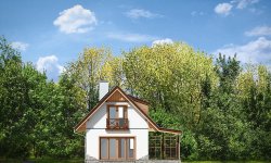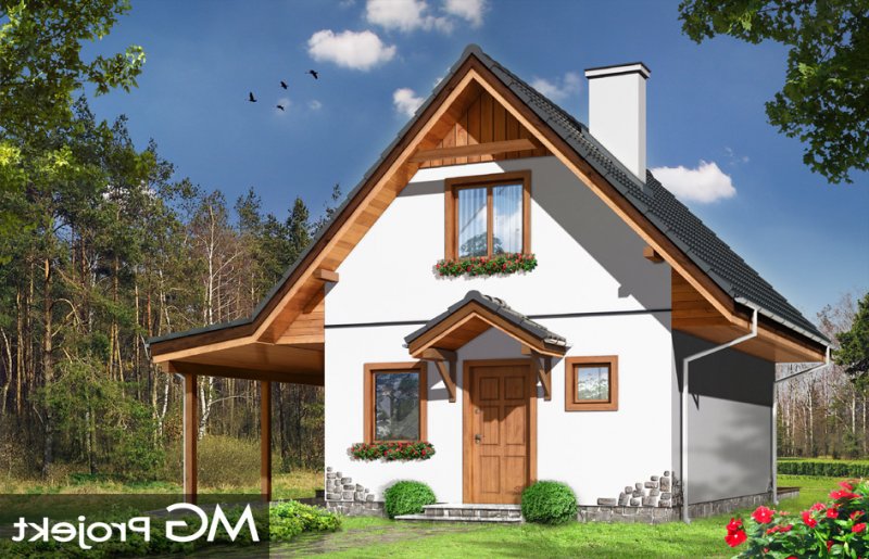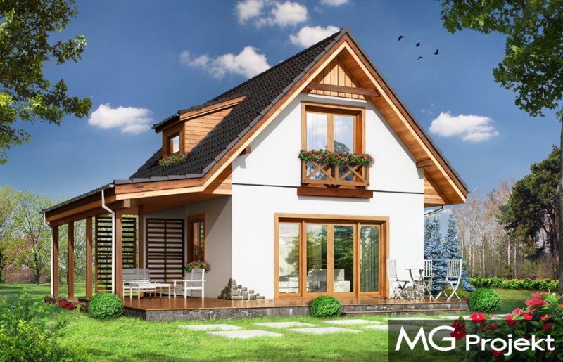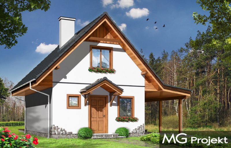 Szarejka to kolejny nieduży domek jednorodzinny z oferty pracowni MG Projekt. Może służyć zarówno jako całoroczny budynek mieszkalny jak i domek letniskowy. Dom ma bardzo prostą konstrukcję, zbudowaną na planie prostokąta. Bryła jest przekryta symetrycznym dwuspadowym dachem, z dobudowanym zadaszeniem wiaty garażowej i podcienia tarasu. Prosta bezpretensjonalna forma i detale wykończenia elewacji dają w efekcie ciekawy wygląd domku. Szarejka została zaprojektowana z myślą o maksymalnym otwarciu wnętrza na ogród - stąd duży, częściowo zadaszony taras, do którego dostajemy się z salonu przez szerokie przeszklone drzwi. Taras dopełnia wnętrze - stanowi jego przedłużenie. Będzie można na nim udanie spędzać czas również przy niepogodzie lub przy zbyt ostrym słońcu - dzięki dużemu podcieniowy. Wiata garażowa - bardzo przydatna, nawet jeśli nie będzie służyła dla samochodu, to może stanowić doskonałe schronienie dla drewna do kominka, czy sprzętów ogrodowych. Wnętrze domu to salon z aneksem kuchennym na parterze. W najbardziej wyeksponowanym miejscu salonu znajduje się kominek, oraz drewniane schody na poddasze. Na poddaszu znajdują się dwie sypialnie z dodatkową toaletą (poza łazienką na dole). Dom został zaprojektowany w konstrukcji szkieletowej drewnianej. Budynek jest ogrzewany kominkiem i elektrycznymi grzejnikami. Z uwagi na bardzo dobre docieplenie przegród będzie ekonomiczny w późniejszej eksploatacji - nie wymaga dużo energii do ogrzania wnętrza. Pracownia dysponuje też projektem w wersji odbicia lustrzanego.