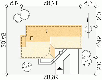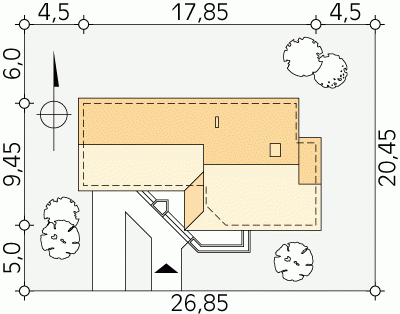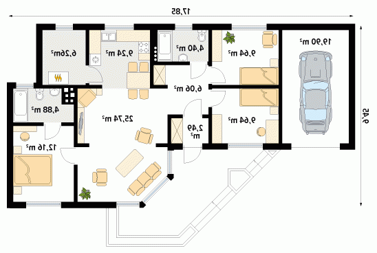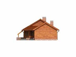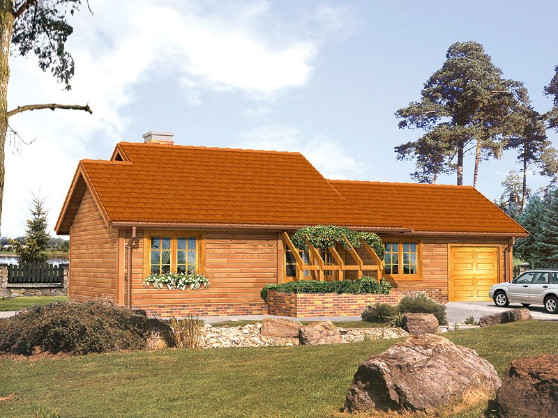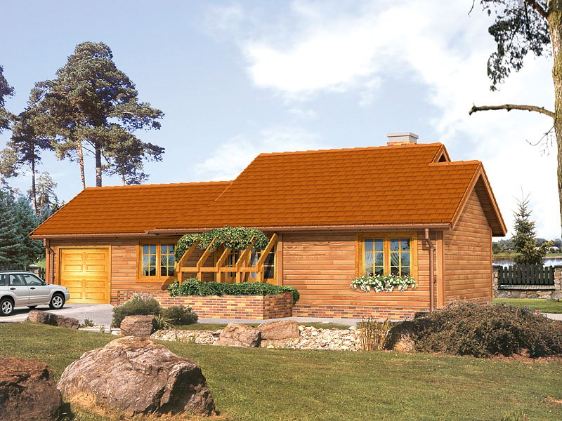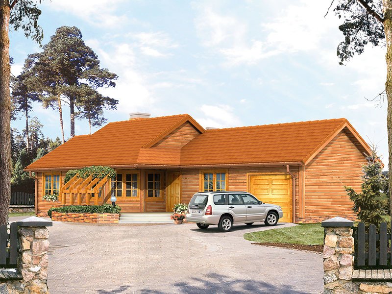 Jednorodzinny dom parterowy. Posiada trzy pokoje sypialne, w tym jeden z własną łazienką. Garaż w bryle budynku. Częściowo zadaszony taras.