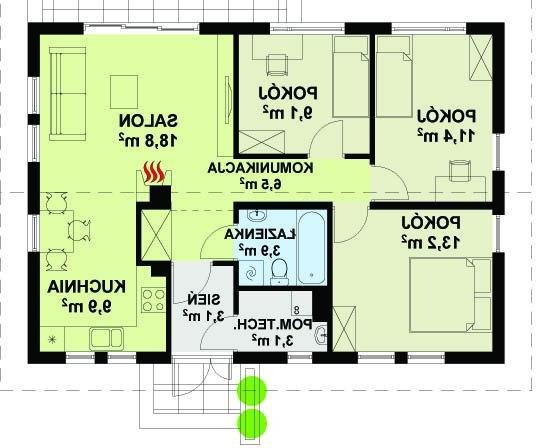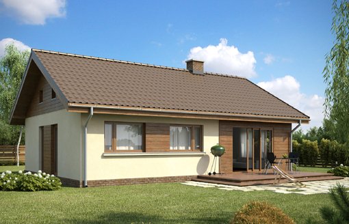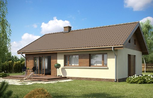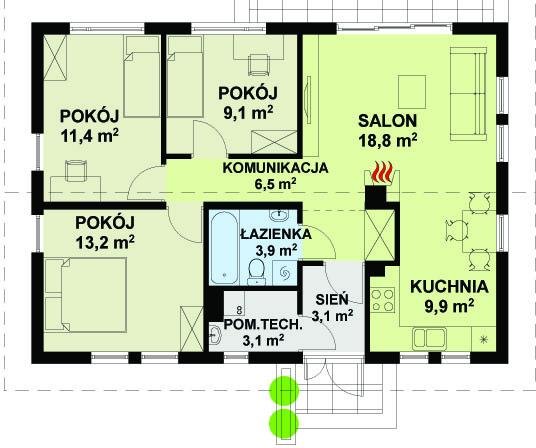 Mały, parterowy domek, w którym dzięki niezwykle funkcjonalnemu rozłożeniu pomieszczeń program użytkowy dla czteroosobowej rodziny zmieszczono na zaledwie 78,8m2. Dzięki temu zabiegowi dom jest niezwykle tani w budowie jak również, co bardzo ważne, w późniejszej eksploatacji. Dom posiada trzy sypialnie, salon, kuchnię, łazienkę oraz wiatrołap i pomieszczenie gospodarcze.