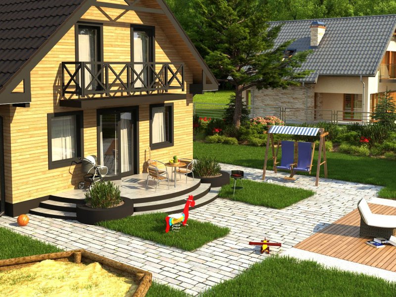 Na parterze usytuowano wygodny pokój dzienny z przejściem do kuchni. Salon, w którym znajduje się narożny kominek, połączony jest jedno-przestrzennie z aneksem jadalnym. W innym wariancie usytuowaliśmy „podwójny” kominek na ścianie od ogrodu– tworząc na tarasie miejsce do grilla. Balkon znajduje się od strony ogrodu, co dodatkowo daje cień na tarasie w czasie upalnych dni.
