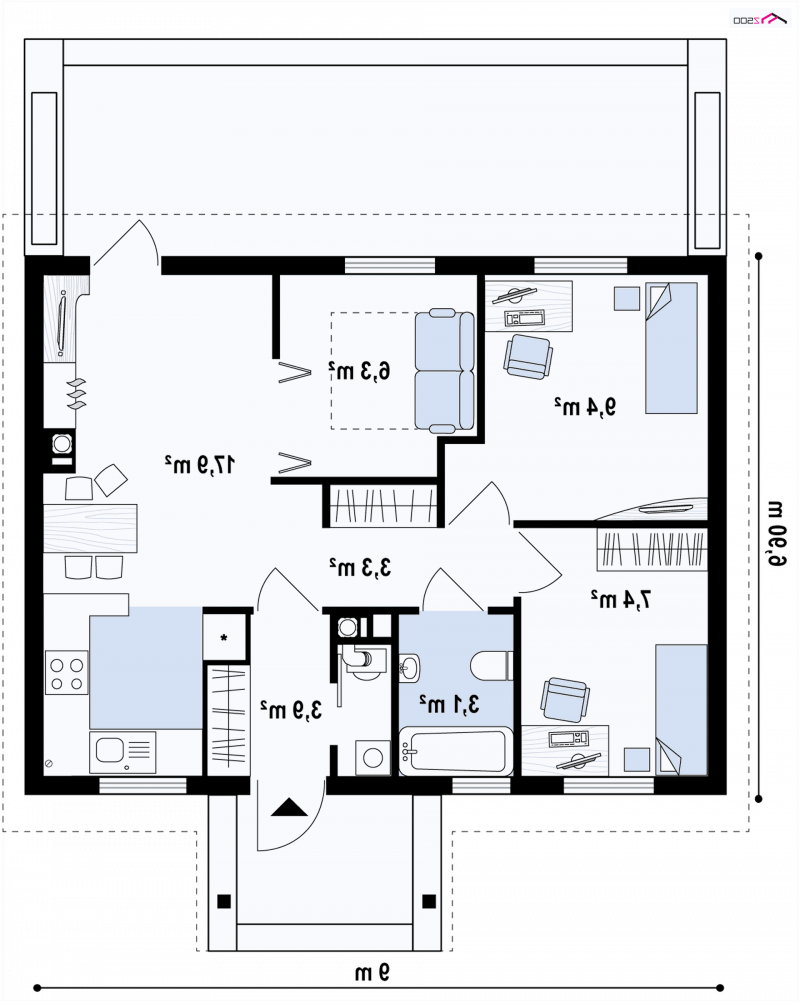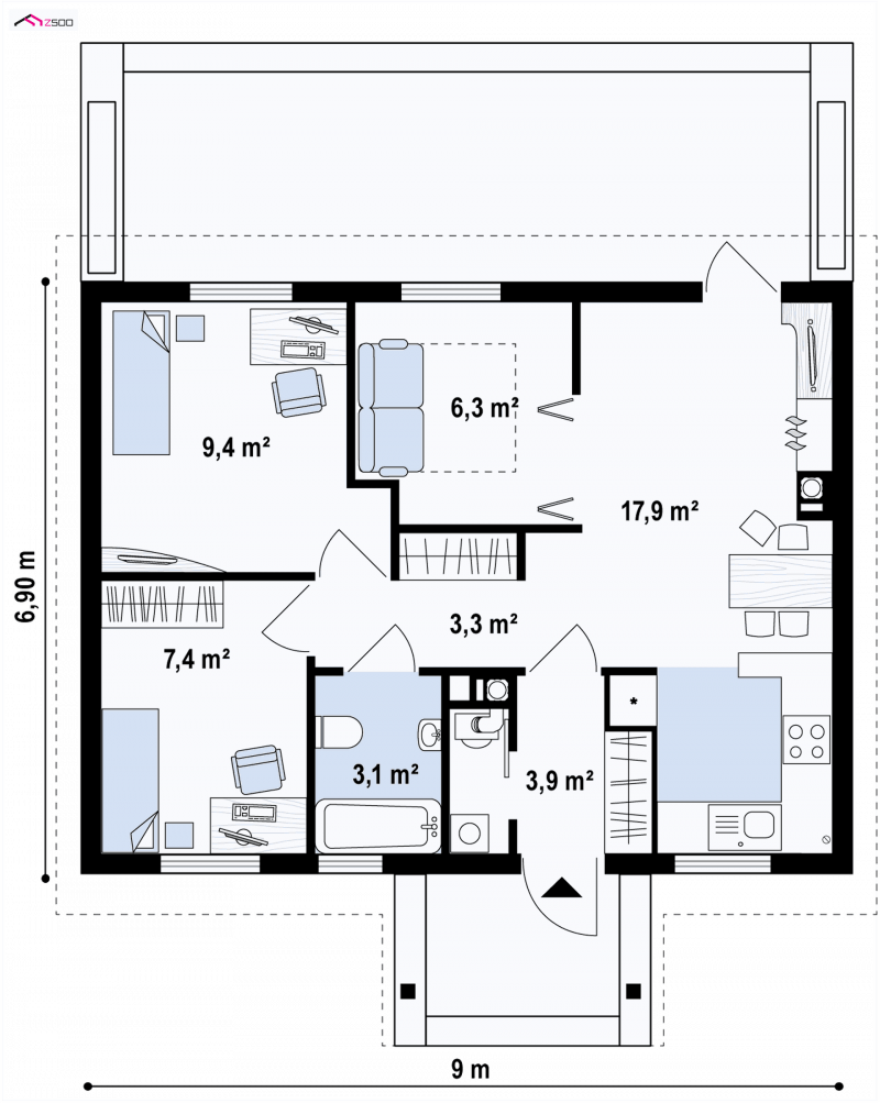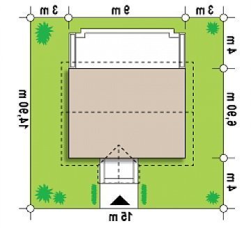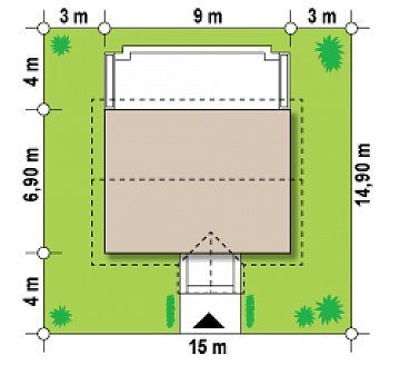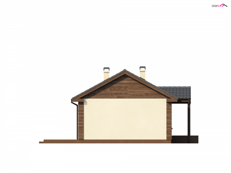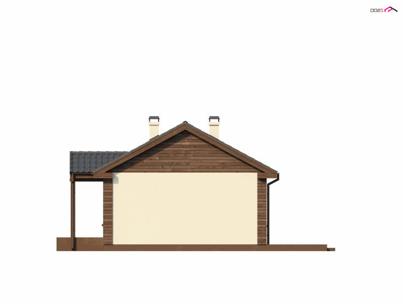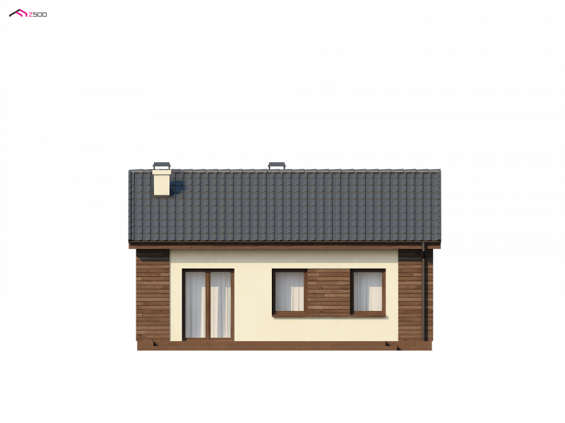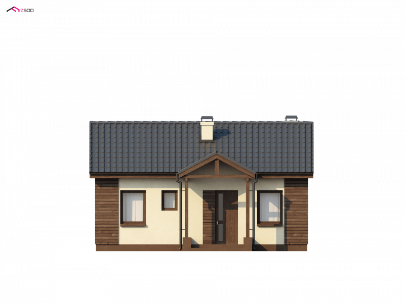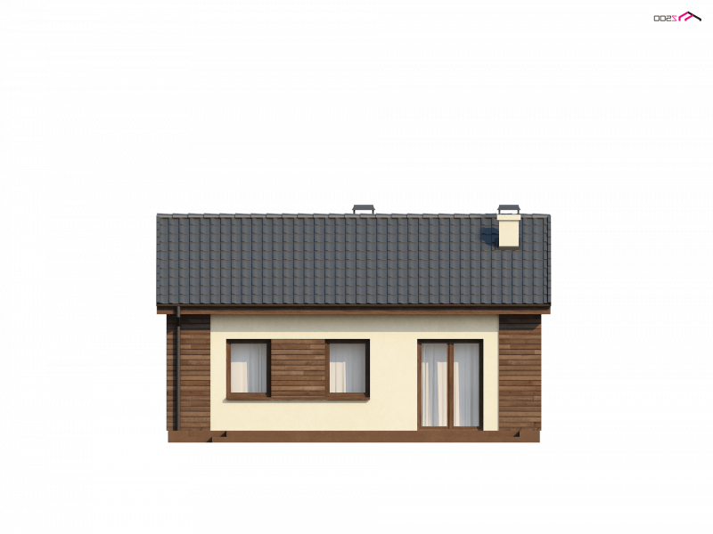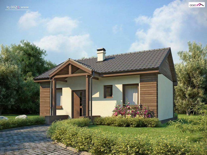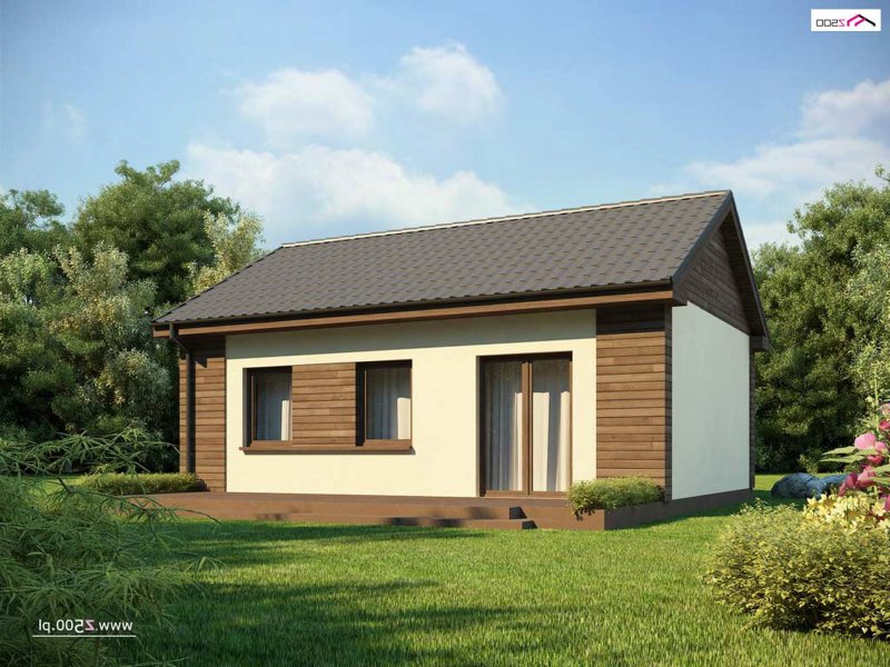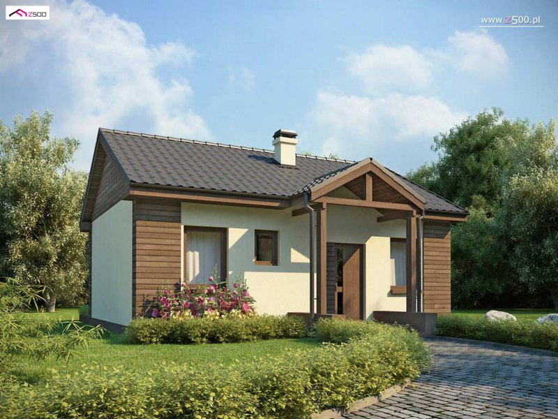 Dom ten może być zbudowany szybko i niewielkim kosztem. Budynek jest mały i przez to ekonomiczny w eksploatacji. Brak wewnętrznych ścian konstrukcyjnych umożliwia dowolną aranżację wnętrza, uzależnioną od potrzeb użytkowników. Kompozycja elementów elewacji sprawia, że bryła budynku może wyglądać tradycyjnie lub nowocześnie (oszczędne detale, okna bez podziału, faktura ścian). Wewnątrz domu optymalnie zagospodarowano niewielką powierzchnie. Salon częściowo podzielono drzwiami składanymi, aby w ciągu dnia pełnił funkcję przestronnego pokoju dziennego, a nocą może stanowić wydzielony aneks sypialny. Dodatkowo zaprojektowano dwa niezależne pokoje tak, aby w niewielkim wnętrzu mogła zamieszkać nawet 4-osobowa rodzina. W przedsionku i w holu zaplanowano miejsca na szafy wnękowe.