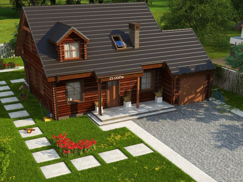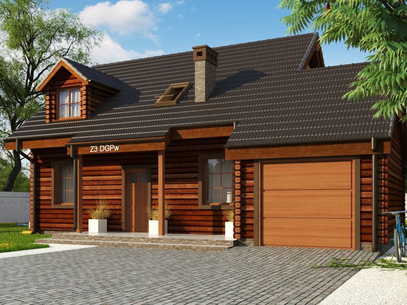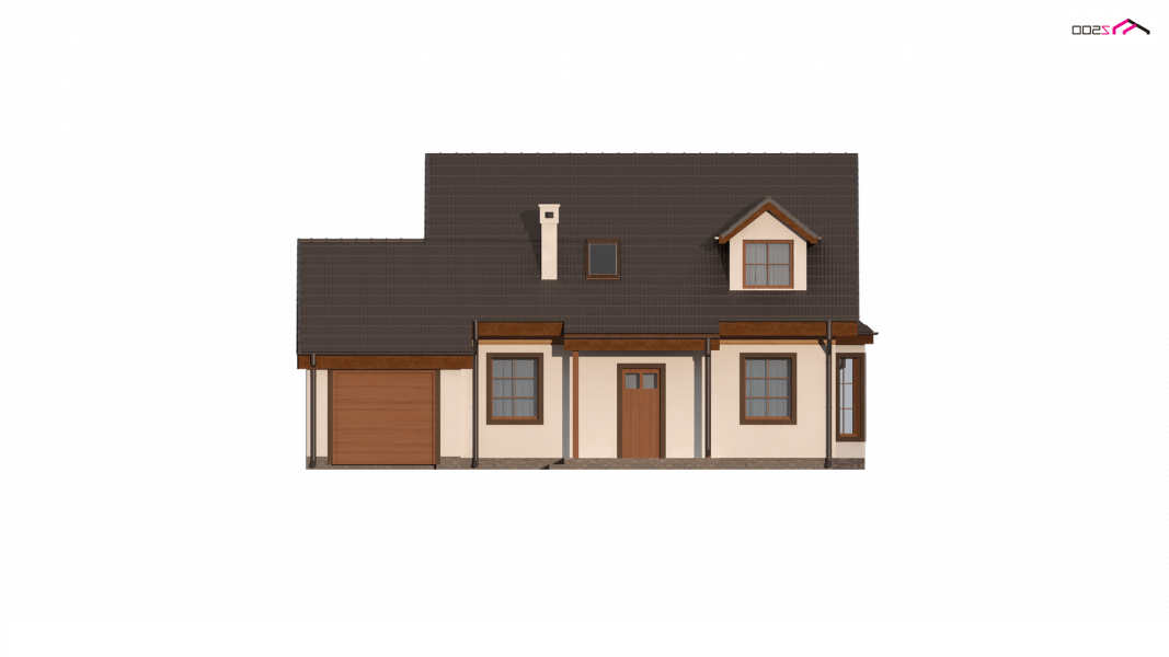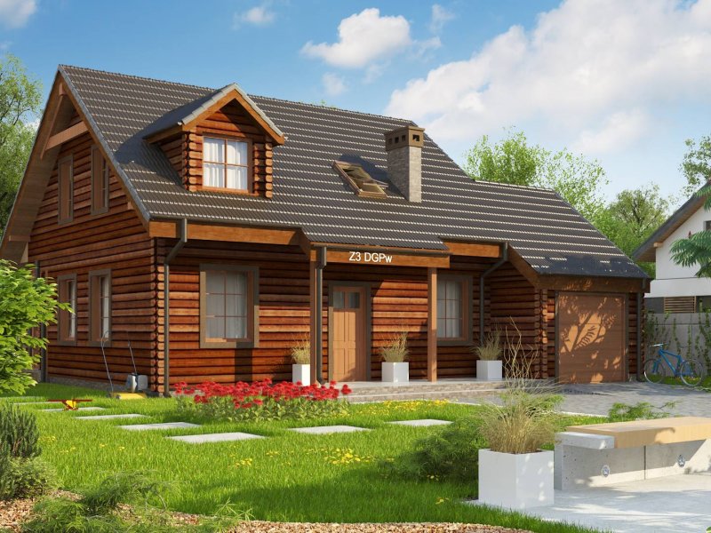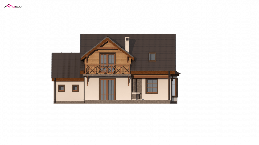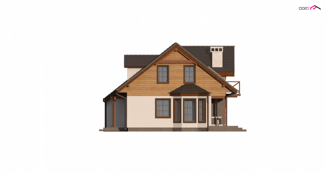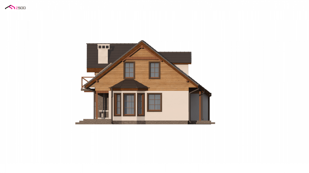 Projekt domu Z3 ( szkielet drewniany ) Wariant z wykuszem i garażem bocznym (18,72m2) po prawej stronie. Możliwość przejścia do części mieszkalnej przez pomieszczenie gospodarcze.