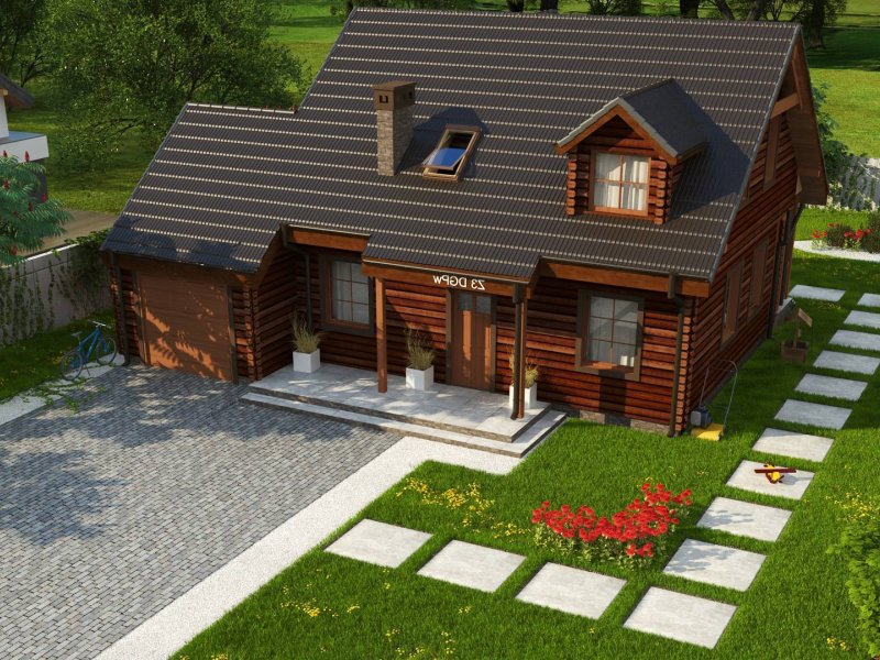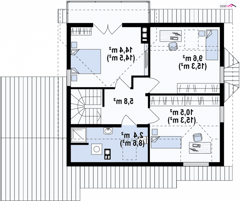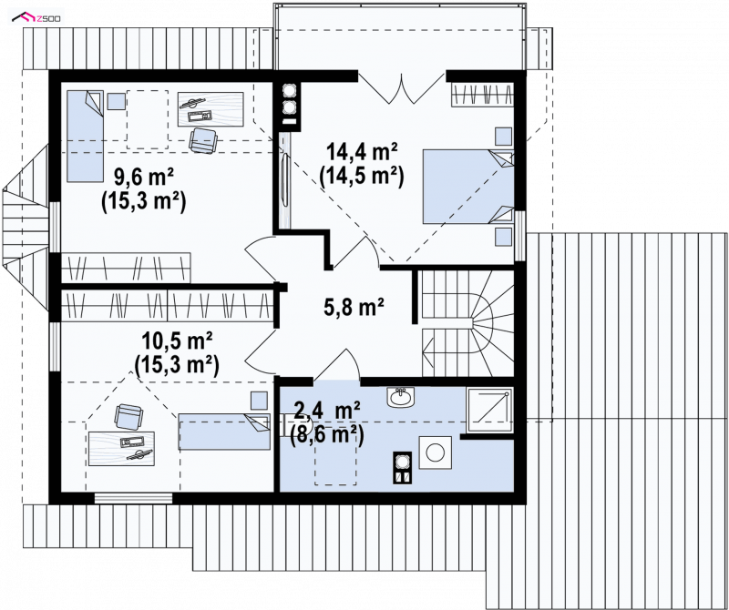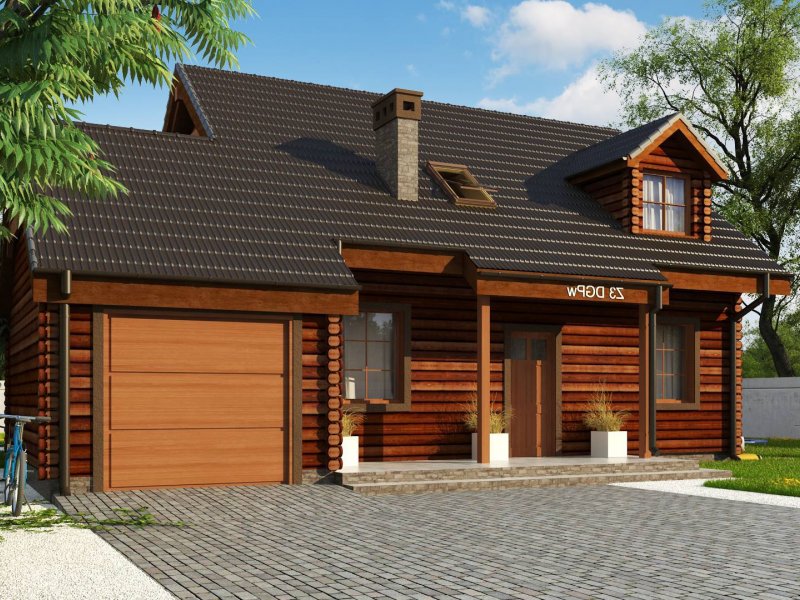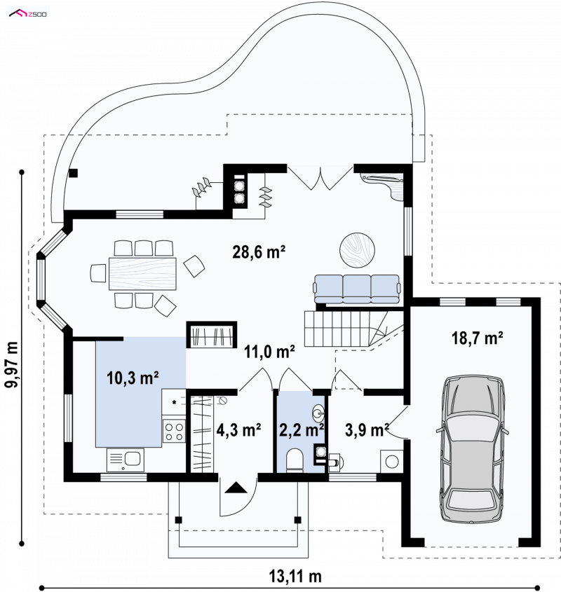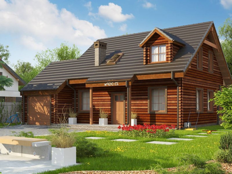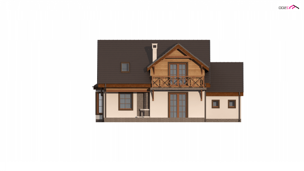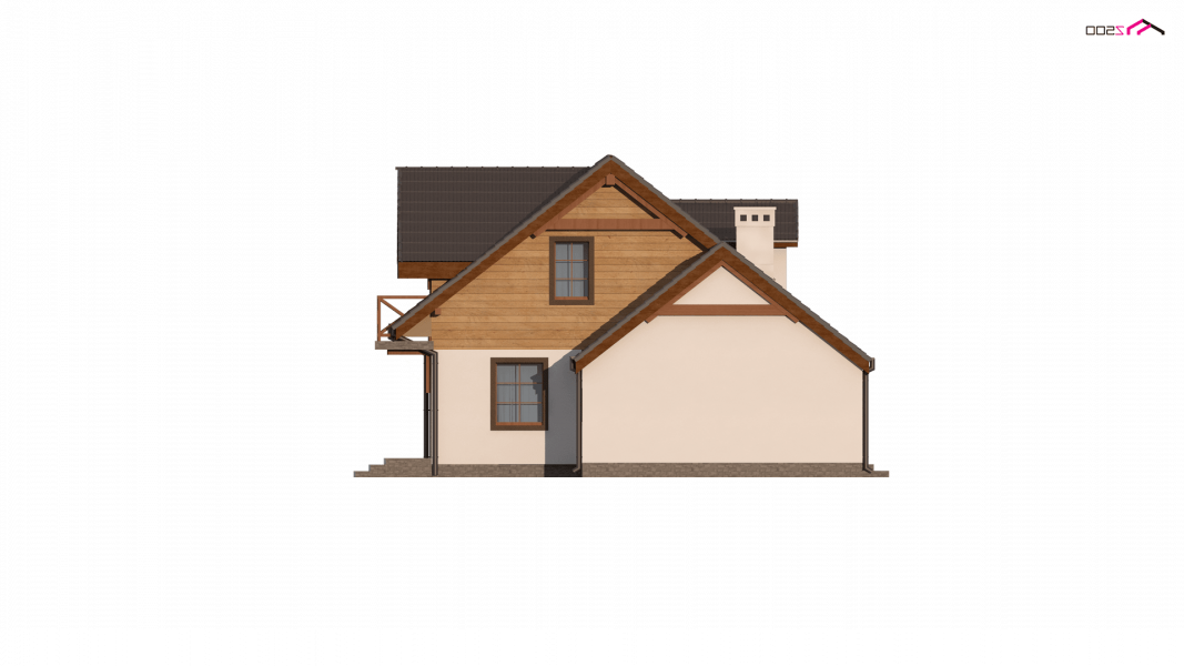 Projekt domu Z3 ( szkielet drewniany ) Wariant z wykuszem i garażem bocznym (18,72m2) po prawej stronie. Możliwość przejścia do części mieszkalnej przez pomieszczenie gospodarcze.