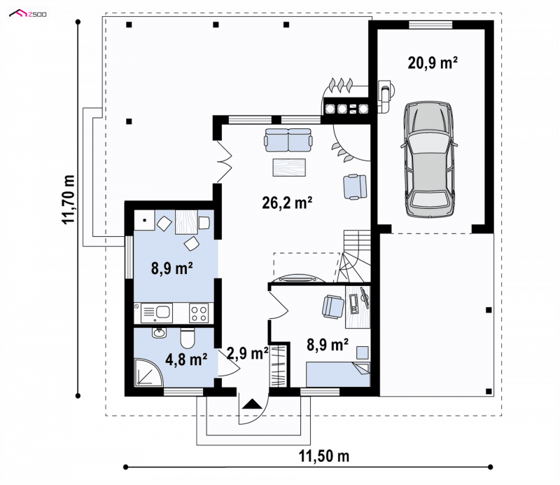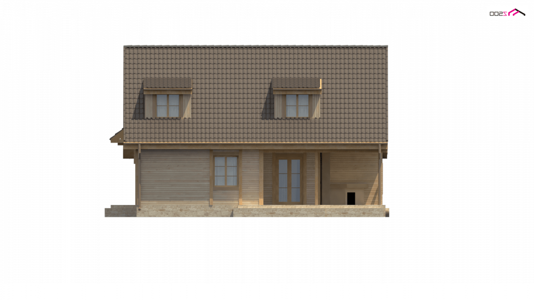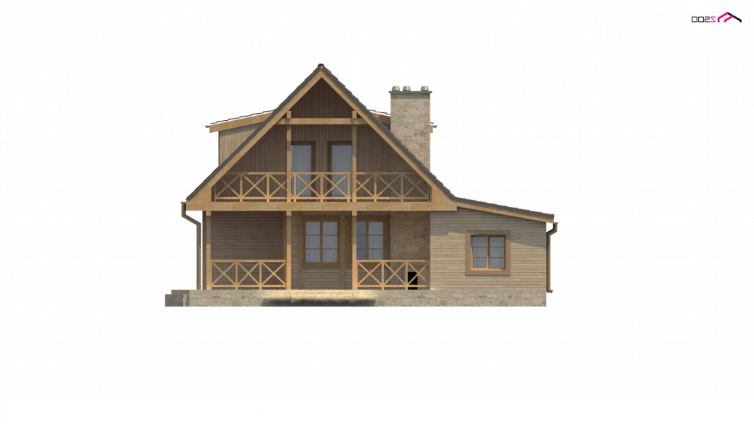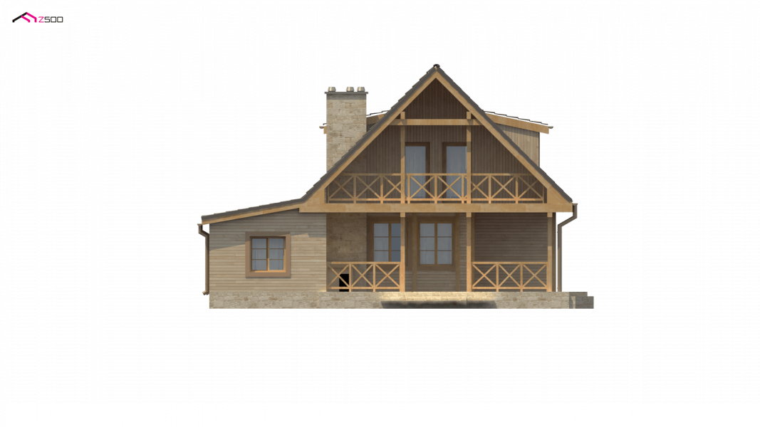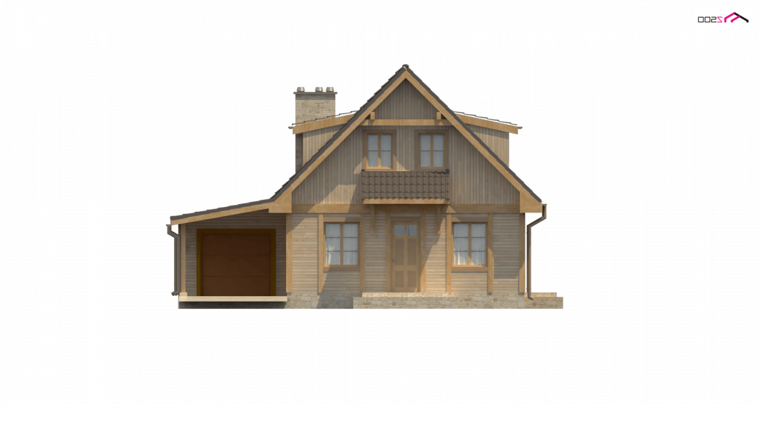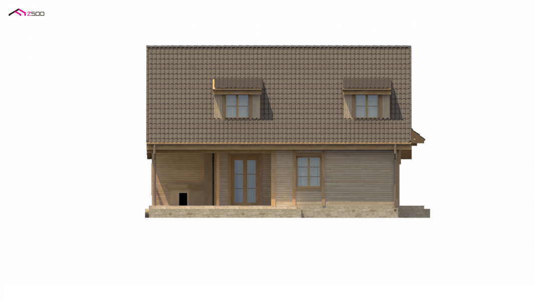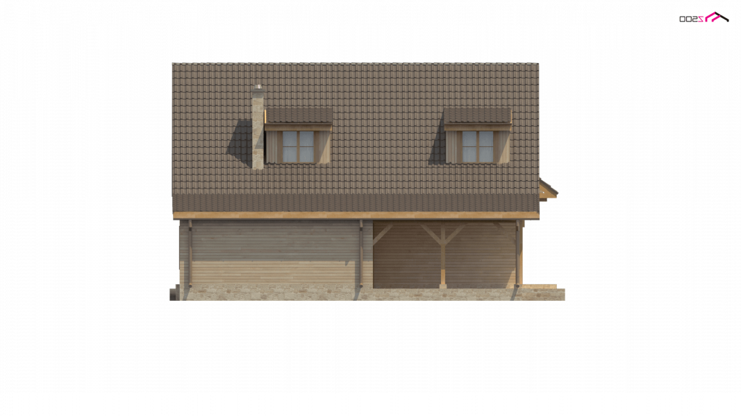 Projekt domu Z30 wyróżnia się tym, że w części ogrodowej zaprojektowano werandę z miejscem na kominek. Wejście do budynku osłonięto daszkiem wspartym na mieczach. Dodatkowo z prawej strony zaprojektowano garaż z wiatą od przodu i pomieszczeniem technicznym z tyłu. Cały garż przykryty jest dachem pulpitowym o nachyleniu 10 stopni.
