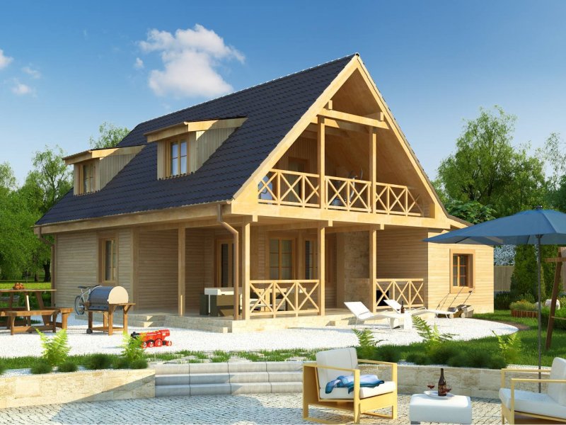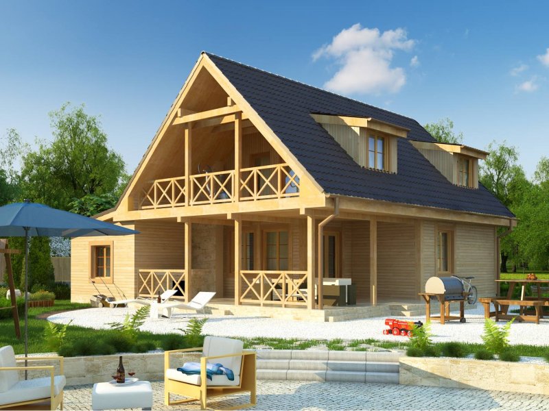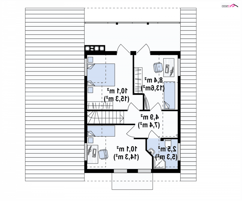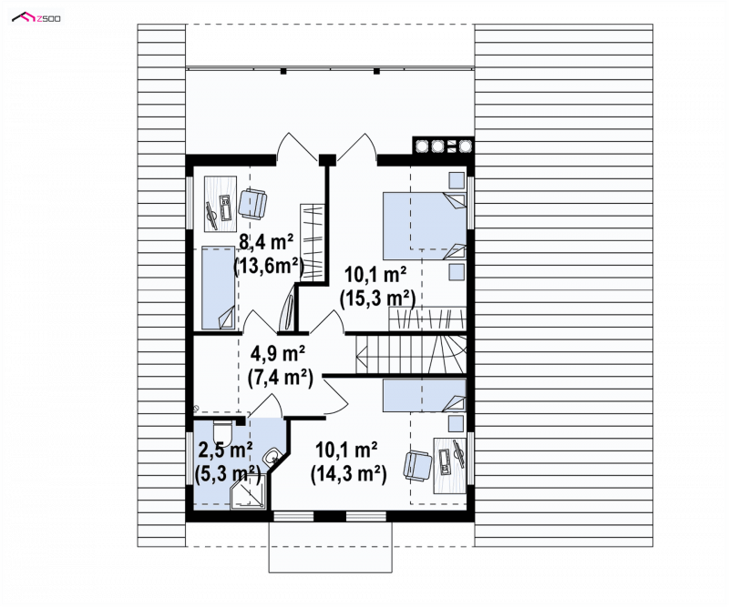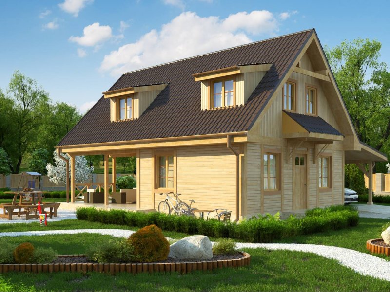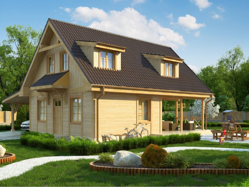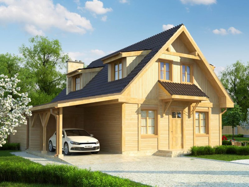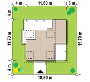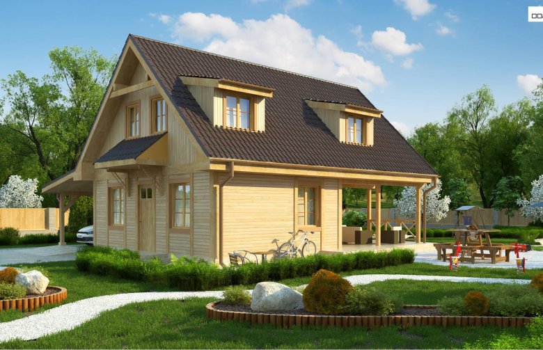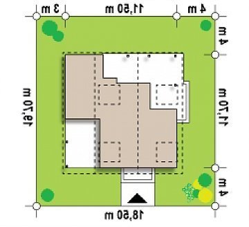Projekt domu Z30 wyróżnia się tym, że w części ogrodowej zaprojektowano werandę z miejscem na kominek. Wejście do budynku osłonięto daszkiem wspartym na mieczach. Dodatkowo z prawej strony zaprojektowano garaż z wiatą od przodu i pomieszczeniem technicznym z tyłu. Cały garż przykryty jest dachem pulpitowym o nachyleniu 10 stopni.