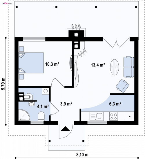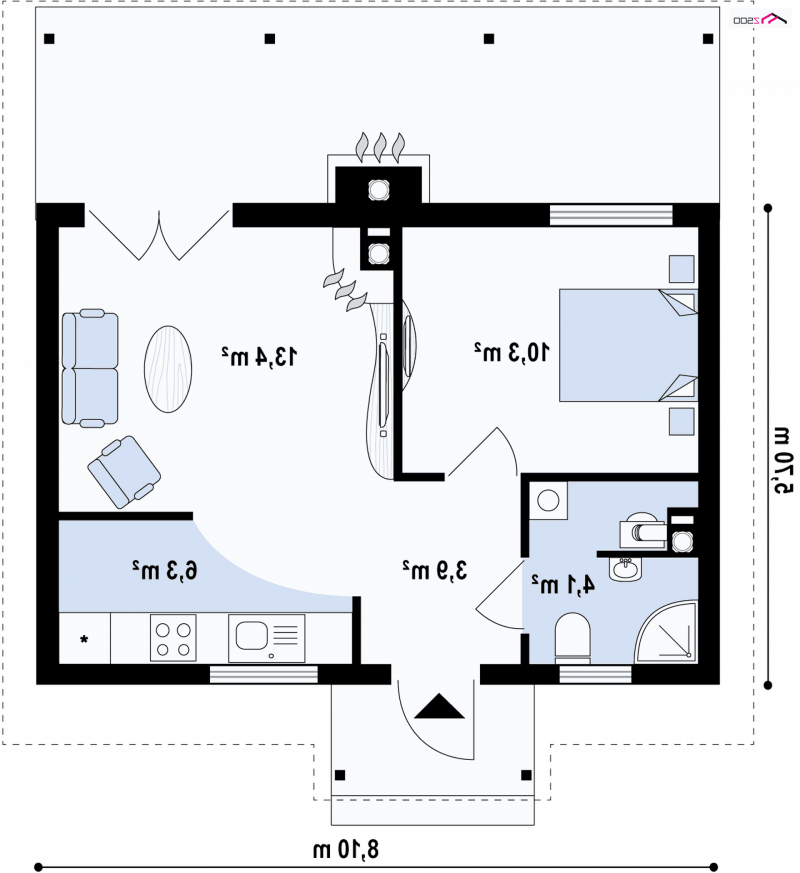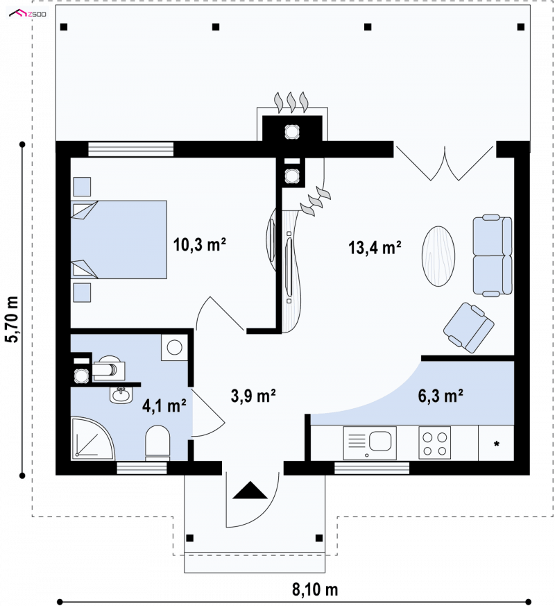 Z42 D jest to niewielki dom na działkę, w wersji drewnianej. Dzięki prostej bryle jest szybki w realizacji i bardzo tani w eksploatacji. Może pełnić funkcję domu letniego lub całorocznego pozwalając na wygodny wypoczynek w sezonie letnim lub zamieszkanie w okresie zimowym. Brak wewnętrznych ścian umożliwia dowolną aranżację wnętrza w zależności od potrzeb mieszkańców. Niewielką powierzchnię może zrekompensować otwarcie domu na otoczenie, uzyskane dzięki zadaszonej werandzie.