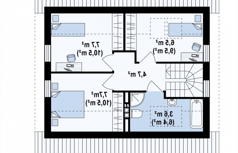 Na piętro prowadzi centralnie zlokalizowana klatka schodowa. Znajdują się tam trzy pokoje, każdy posiada miejsce na szafę - garderobę i dość przestronna łazienka.