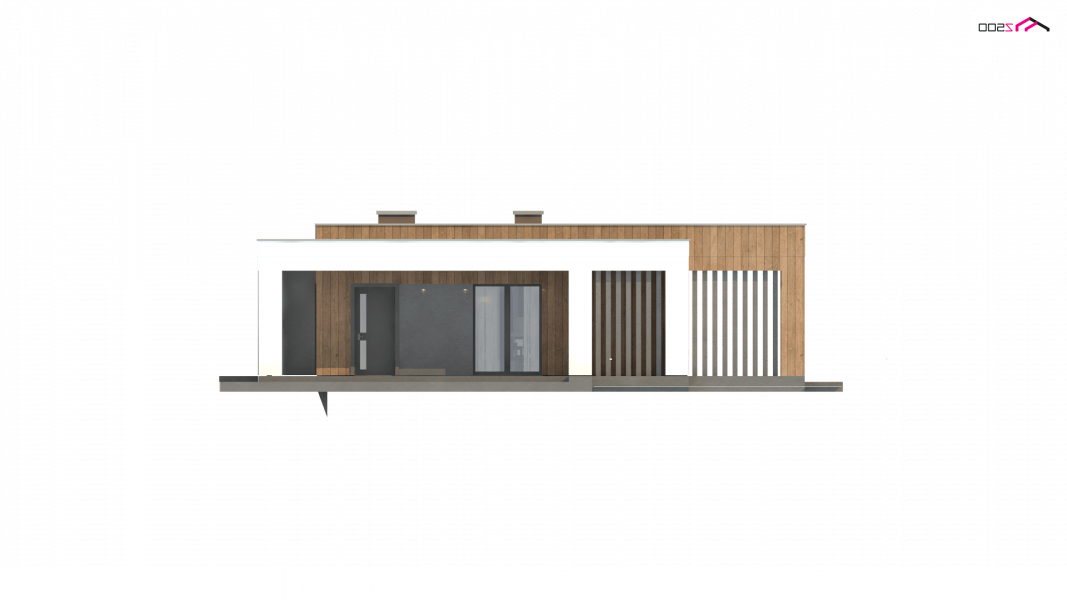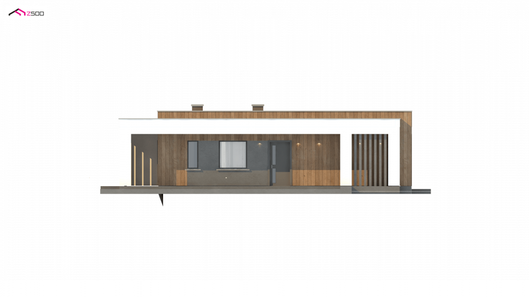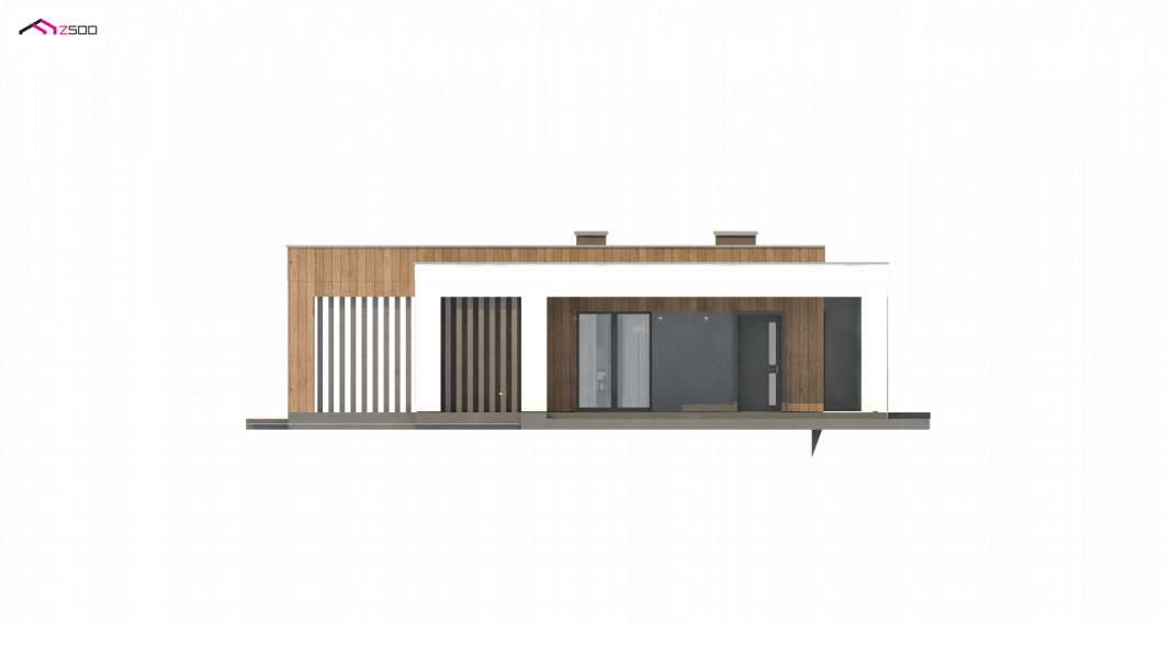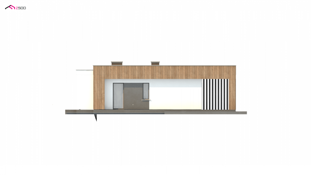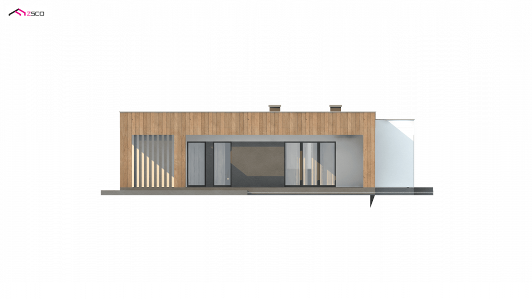 Zx76 D to parterowy budynek z płaskim dachem bez garażu. Posiada duże przeszklenia i zadaszenia nad częścią wejściową i ogrodową.